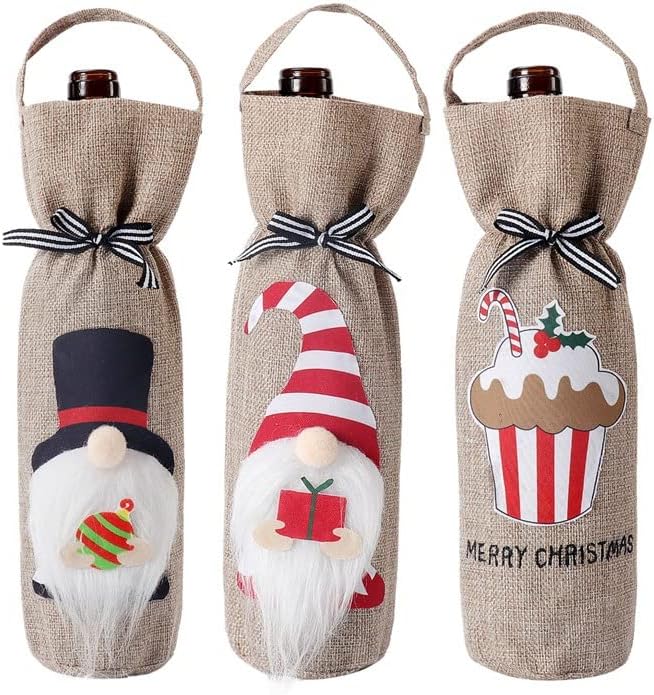 Copribottiglia di vino natalizio da 3 pezzi, sacchetti per vino in iuta con manici con coulisse, sacchetti regalo per vino natalizio per feste, matrim