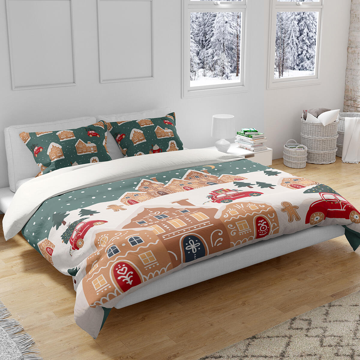 Parure copripiumino Natale 250x240 cm piu' coppia federe 50x80 cm. Stampa paesaggio natale innevato. 100% cotone