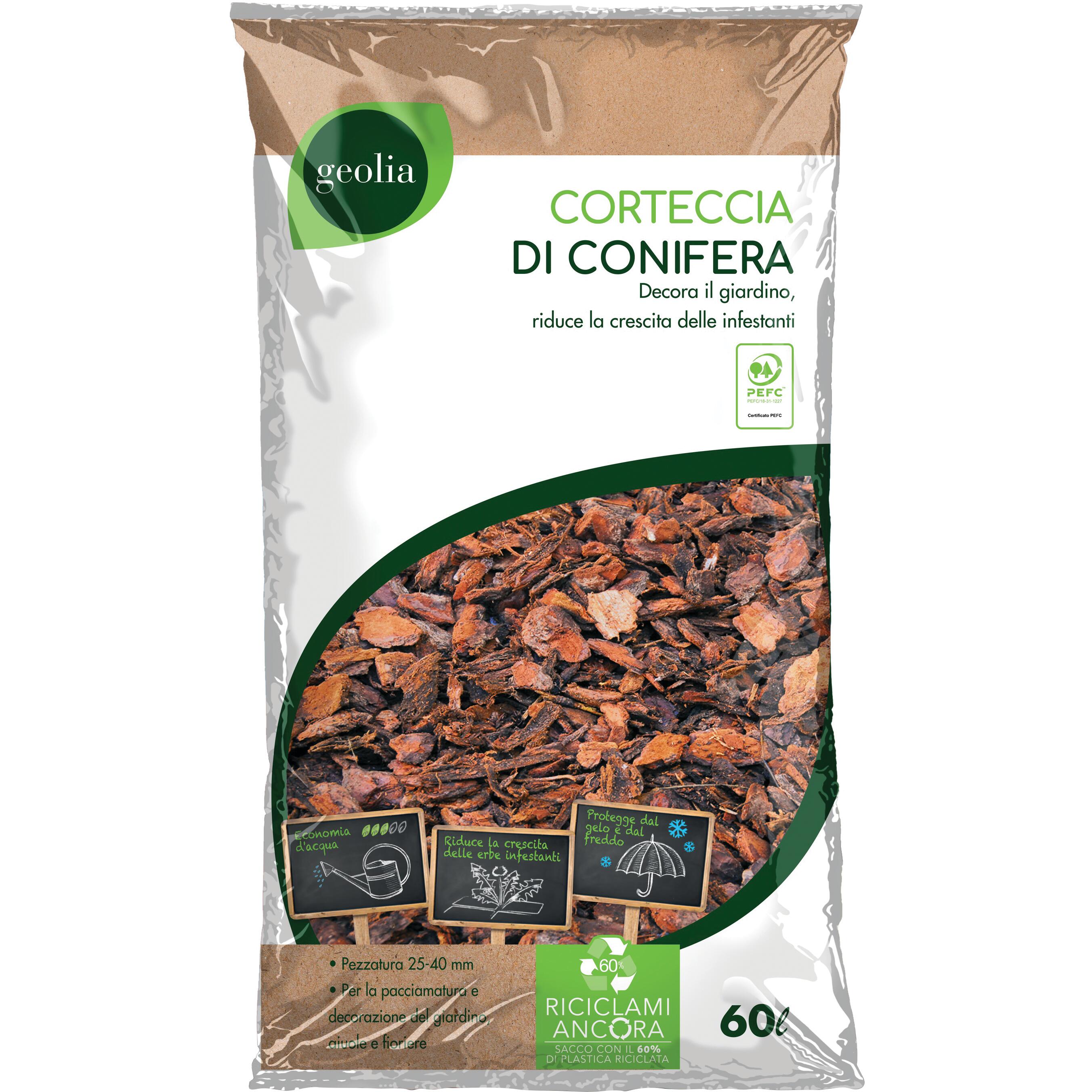 La corteccia di conifera Geolia sparsa adeguatamente nelle aiuole del giardino, sotto ai cespugli e alla base dei frutteti agisce da sicuro diserbante, esercita un'azione di isolamento termico e si trasforma infine in un eccelente ammendante biologico. L'uso della Corteccia di conifera Geolia riduce i tempi di manutenzione del giardino e del frutteto e produce un notevole risparmio di fatica e manodopera. PEZZATURA: 25-40 mm