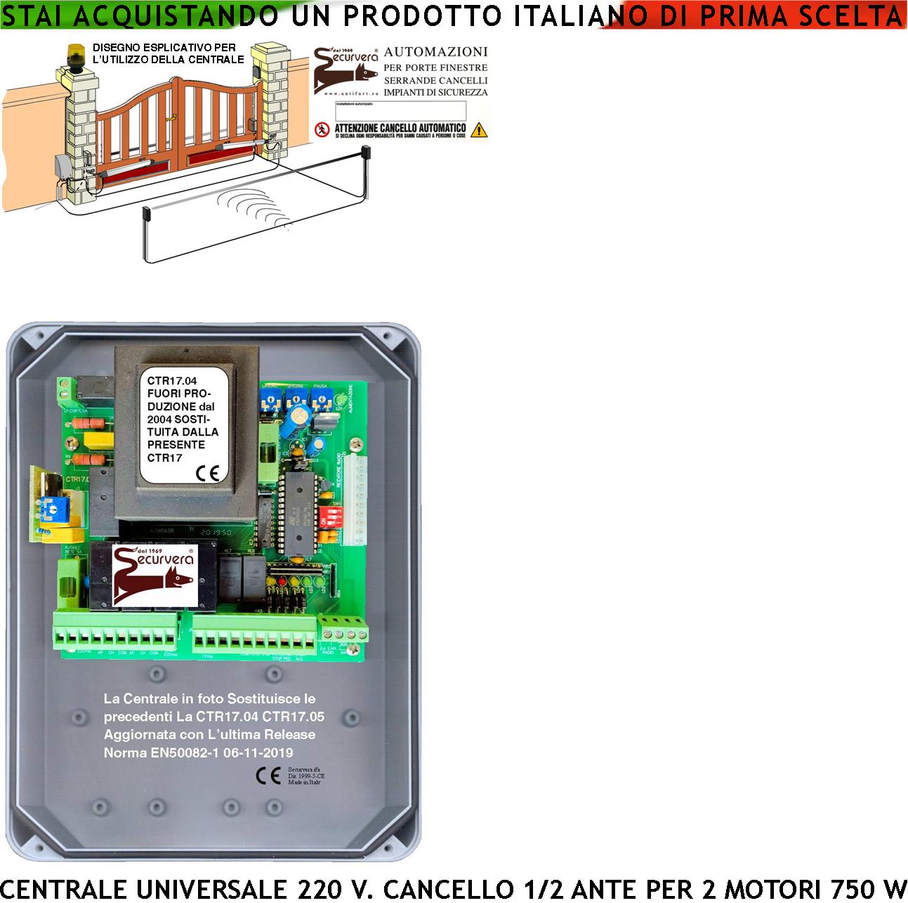 SV-CTR17LEBRE ,Centrale (PM-8000 Sostituisce L'originale CTR-17 ,Nuova versione aggiornata ultima ,release, Stessi collegamenti) per il comando e la gestione di un cancello a una oppure due ante. Regolazione: tempi di lavoro, frizione elettronica ,regolabile tramite trimmer (Gestisce motori 220 1 Cavallo), sfasamento ante tempo di pausa tramite trimmer. Selezione prestazioni: automatico, semiautomatico, passo passo. Ingressi di comando apertura: condominiale ,e ,pedonale. Connessione per la scheda radio (esclusa). Uscita elettroserratura. Lampeggi differenziati indicano le manovre in corso. Luce di cortesia da 500 W. a 220 V. Gestione: fotocellula apre, fotocellula chiude. Alimentazione periferiche 24 V. 1 A. ,Alimentazione 220 V. 50 Hz. Contenitore ABS IP55. Dimensioni L178XH248XP90 mm. Peso 1765 gr. ,Cartello ,Monitore in ABS Securvera. ,Prodotto selezionato nello stabilimento della Securvera Roma. Garantito a norma di Legge contro difetti e vi