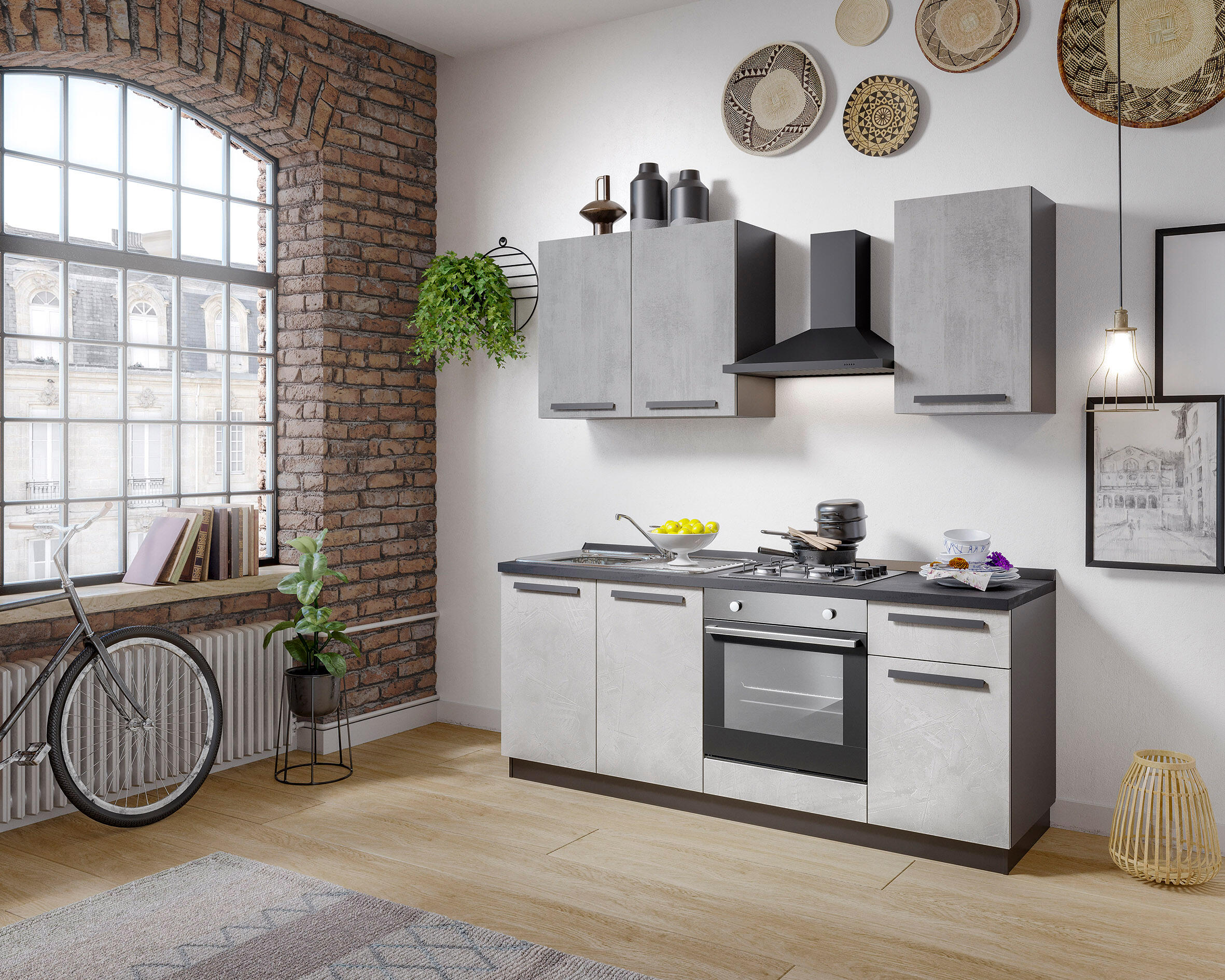 Dora è una cucina lineare di 195 cm, con lavello a sinistra e cappa aspirante Camino. Completa e pronta per l'installazione è fornita già montata. La cucina è composta da: forno, piano cottura, lavello, rubinetto, maniglie alluminio verniciato grigio, 1 cassetto ed 1 anta sottocassetto, ante delle basi colore effetto spatolato chiaro, pensili con ante effetto ossido grigio, struttura robusta colore antracite e top color pietra scuro, zoccolo ispezionabile con piedini livellabili.
