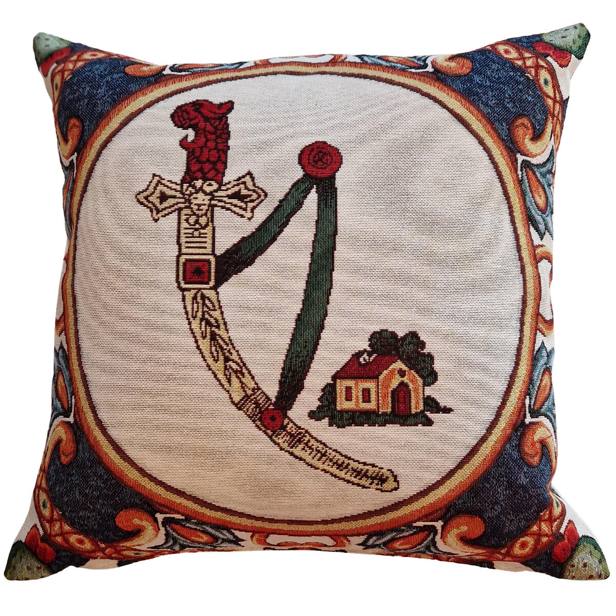 Cuscino quadrato in gobeline con disegno carte di spade siciliane, imbottitura inclusa. Misure 45x45 cm.