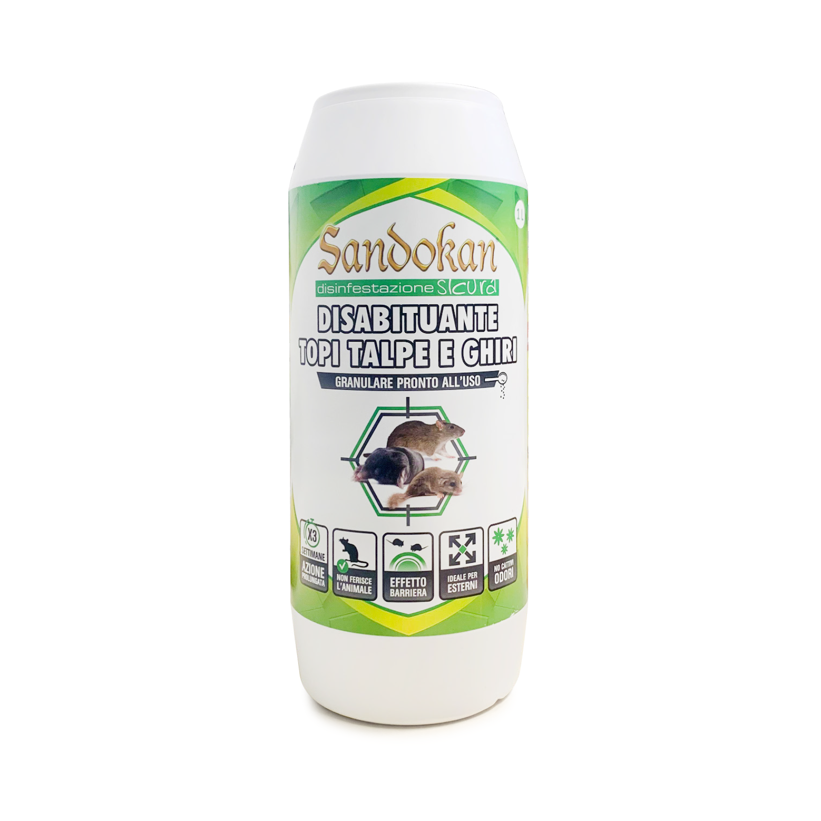 SANDOKAN DISABITUANTE TOPI TALPE E GHIRI GRANULARE 1 KG Il disabituante granulare topi talpe e ghiri Sandokan è un’efficace soluzione per tenere lontani questi roditori indesiderati. Il prodotto, in formulazione granulare è facilmente utilizzabile, non sporca e non produce cattivi odori, rendendo il suo utilizzo una soluzione comoda ed efficace contro topi, talpe e ghiri. La sua formula speciale, con ingredienti repellenti naturali, agisce sul sistema olfattivo di questi roditori creando un ambiente inospitale per loro. Basta distribuire il prodotto nei punti di passaggio o nelle zone infestate e attendere che faccia effetto. Rimane attivo per diverse settimane, proteggendo l’area dal reinsediamento dei roditori. In questo modo, è possibile scongiurare danni e sgradevoli problemi causati da scavi e scarti di questi animali. Istruzioni per l’uso: Deve essere impiegato tal quale, non va diluito in acqua, non deve essere usato in combinazione con altri formulati o in quantità superiori alle dosi indicate di seguito. Distribuire il prodotto uniformemente sulle aree da trattare, utilizzando 20 ml di prodotto ogni metro quadrato di superficie. Per il trattamento dei cumuli di terra lasciati dalle talpe, applicare il prodotto direttamente. Se il fenomeno si ripropone, ripetere il trattamento ogni 2 giorni fino alla scomparsa dell’infestazione. In caso di pioggia o irrigazione ripetere il trattamento poiché l’efficacia del prodotto potrebbe diminuire. PUNTI DI FORZA: Pronto all’uso Non ferisce l’animale Crea un effetto barriera prolungato PLUS PRODOTTO: Formato da 1 Kg No cattivi odori ANIMALE BERSAGLIO: Topi, Talpe, ghiri