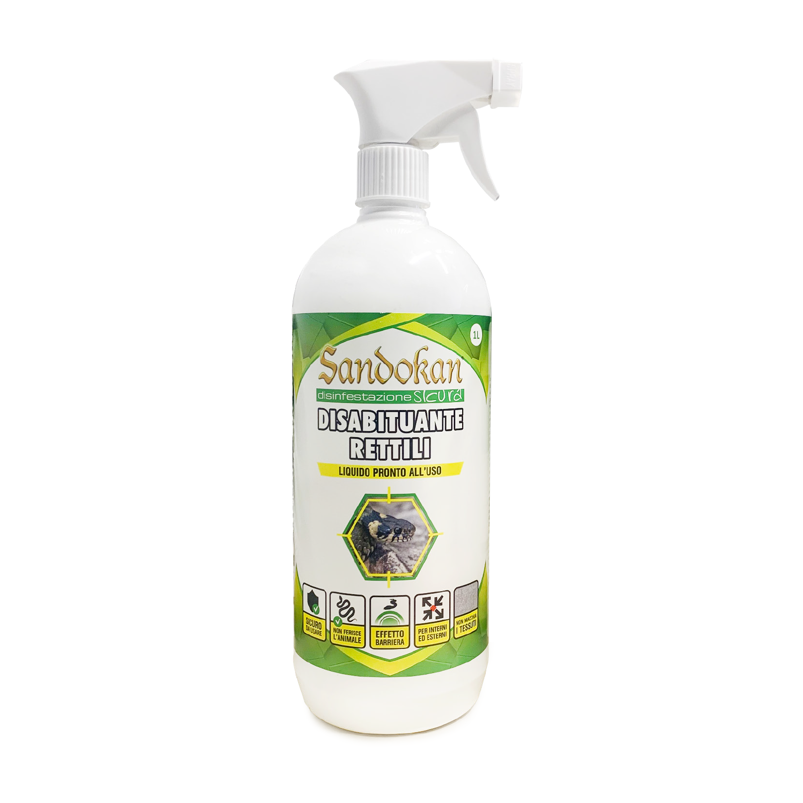 SANDOKAN DISABITUANTE RETTILI LIQUIDO 1 L Il disabituante rettili liquido Sandokan è una soluzione acquosa pronta all’uso che contiene delle sostane sgradite alle specie bersaglio. Questo prodotto sfrutta una speciale formulazione aromatica che emette odori sgradevoli per i rettili, costringendoli ad allontanarsi senza danneggiarli. La comodissima composizione spray, no gas, rende la sua applicazione facile ed immediata. Si applica in tutti i luoghi dove è presente l’infestazione. È perfetto per: Giardini e terrazze, per mantenere serpenti e lucertole lontani da aree verdi o cortili. Zone interne, come cantine o garage, dove i rettili possono nidificare. Famiglie con bambini e animali domestici, grazie alla sua totale innocuità per gli esseri viventi A differenza dei repellenti chimici, questo disabituante è biodegradabile e non lascia residui nocivi, rispettando l’ambiente. È ideale per chi desidera una casa sicura e un giardino pulito, senza mettere a rischio la salute di chi ci vive. Mantieni il tuo ambiente libero da rettili con il disabituante rettili Sandokan. Istruzioni per l’uso: Agitare il contenitore prima dell’uso. Spruzzare il prodotto direttamente sulle superfici dove è stato osservato il passaggio di rettili. Distribuire il prodotto in maniera uniforme evitando il gocciolamento. Ripetere il trattamento fino alla scomparsa delle specie infestanti. Distribuire il prodotto in maniera tale da creare una barriera lungo il perimetro delle abitazioni o in generale degli ambienti da proteggere. PUNTI DI FORZA: Pronto all’uso Non ferisce l’animale Non macchia i tessuti Ideale per interni PLUS PRODOTTO: Formato 1 Litro No cattivi odori ANIMALE BERSAGLIO: RETTILI
