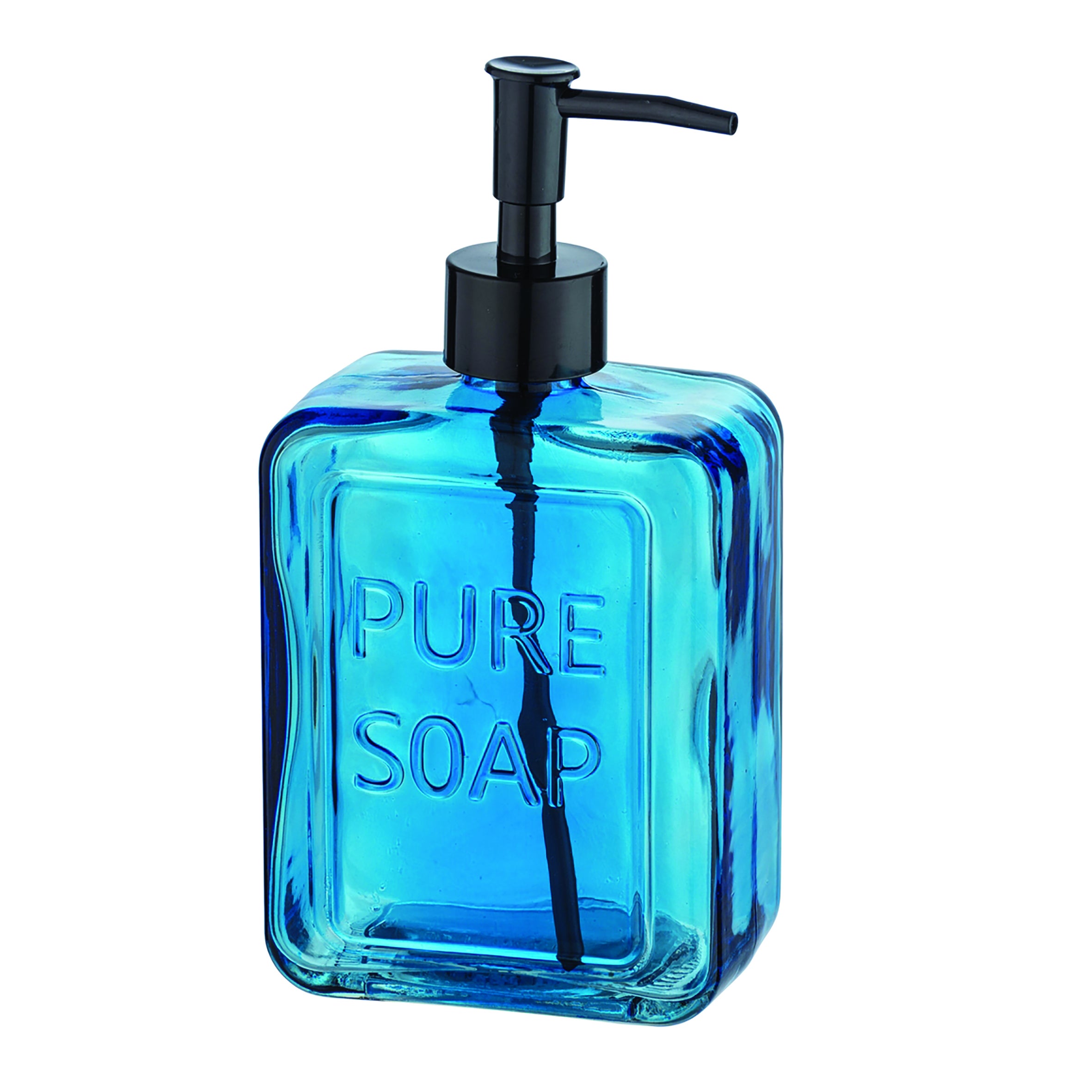 dispenser sapone pure soap realizzato in vetro blu con finitura lucida e ugelli neri, ideale per la zona lavello. di forma rettangolare, è il complemento perfetto per completare il tuo set da bagno o posizionare nella tua cucina. ha una capacità di 0,55 l. misure: 9,5 x 20 x 6 cm (larghezza x altezza x profondità).