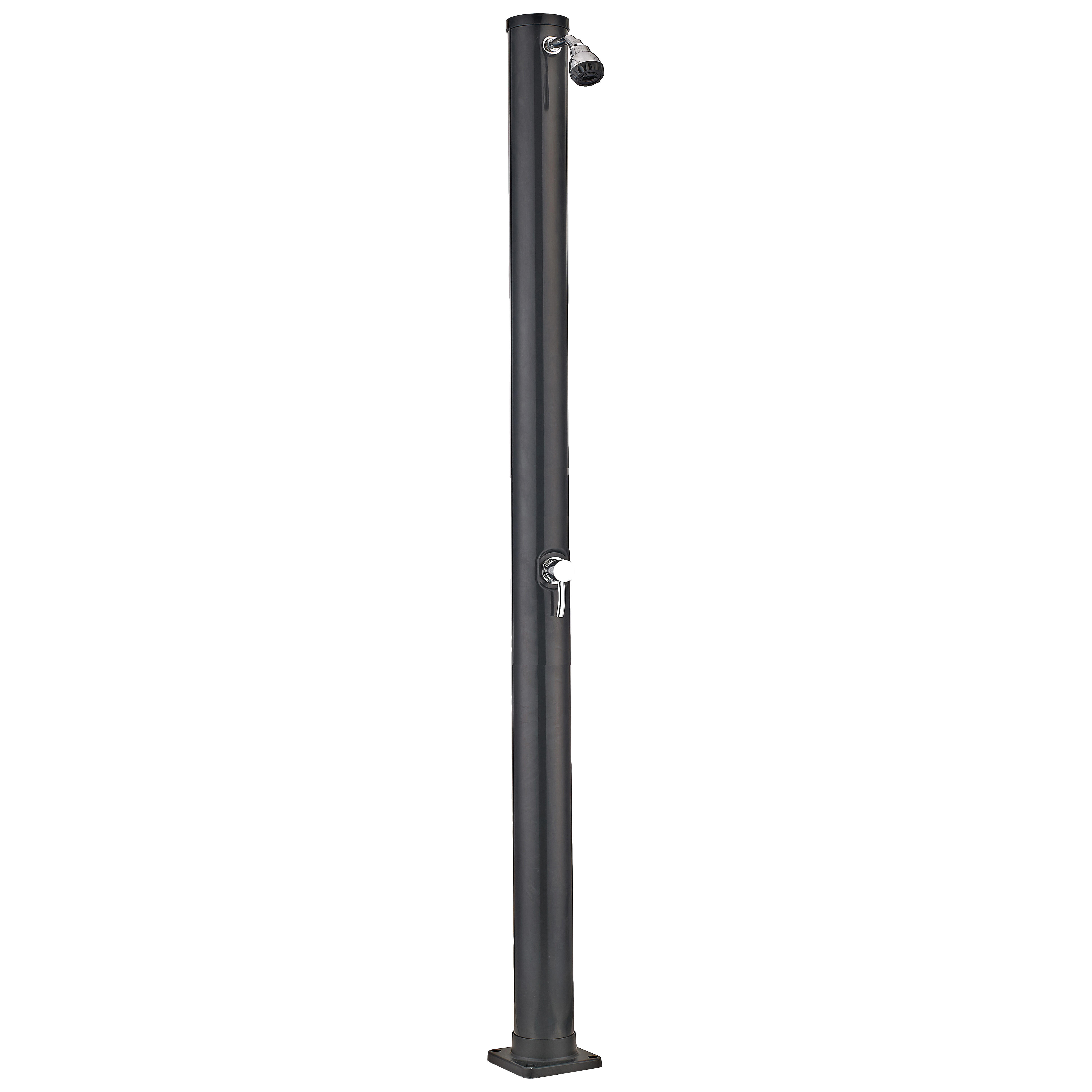 Doccia solare da giardino con soffione orientabile. In PVC, colore nero. Installazione d’appoggio. Altezza: 200 cm. Da collegare a un tubo con accesso all’acqua, la doccia solare riscalda l’acqua sfruttando l’energia solare mediante un serbatoio di accumulo da 20 litri.