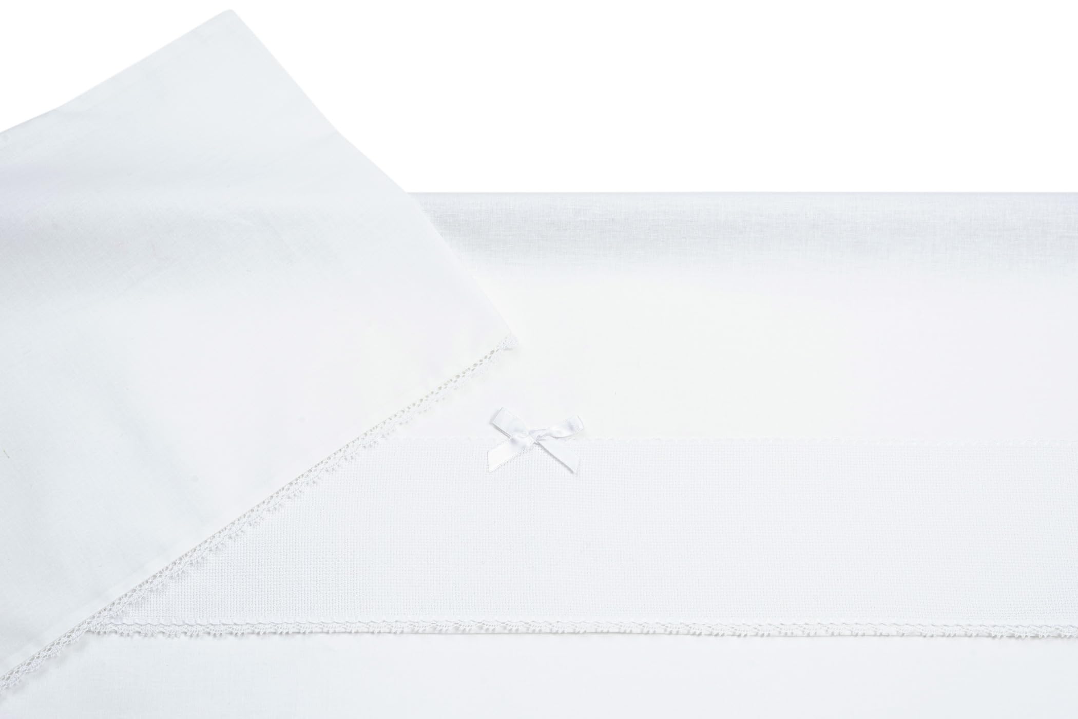 Filet - Set Lenzuolino per Carrozzina 3 Pezzi in Tinta Unita Bianca, 1 Lenzuolo sotto con Angoli, 1 Lenzuolo Sopra con Fascia in Tela Aida da Ricamare