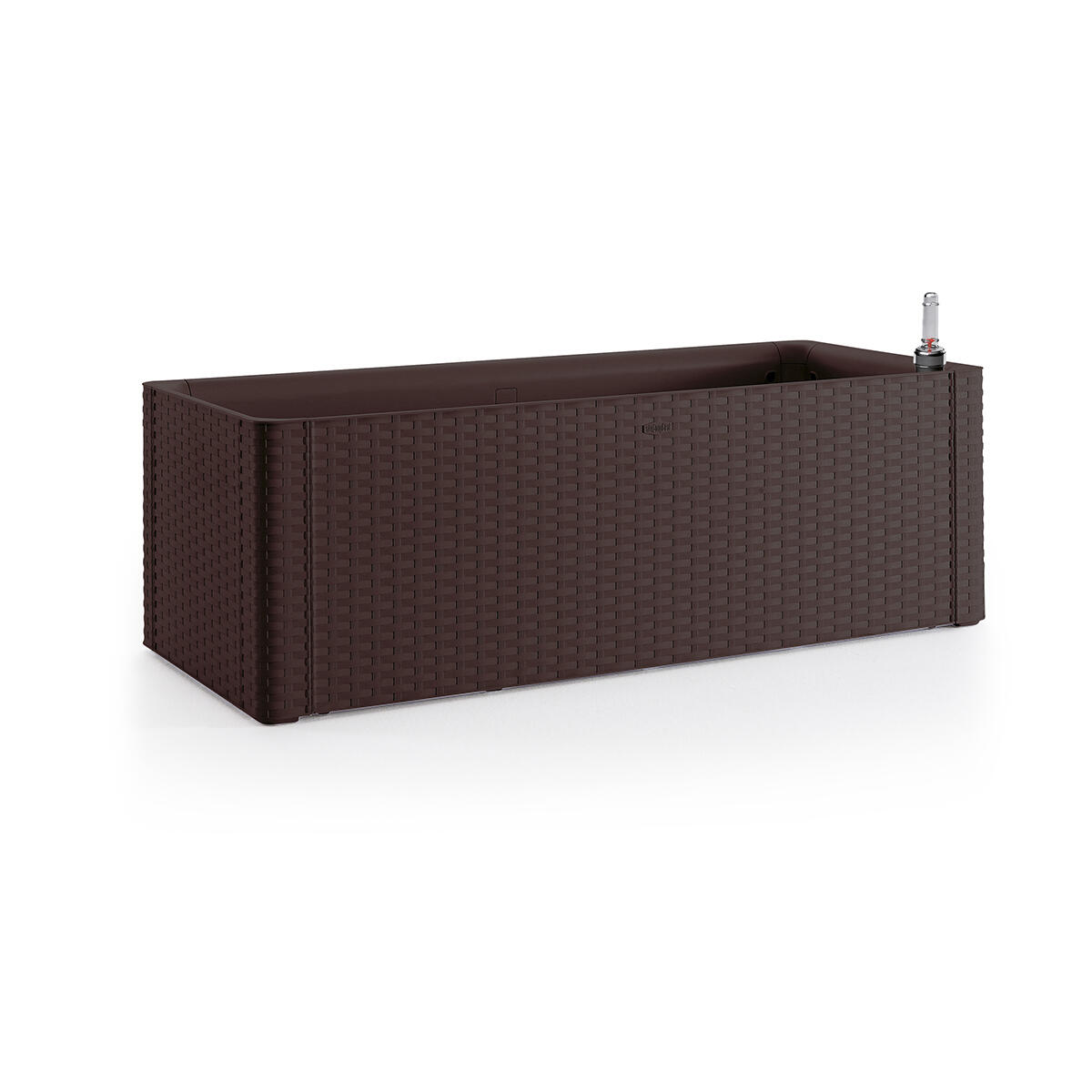 Fioriera colore moka in plastica di forma rettangolare. Adatta a spazi indoor e outdoor, è caratterizzata da un raffinato intreccio ispirato agli arredi naturali. Dotata di riserva d'acqua e l'indicatore di livello che garantiscono una corretta irrigazione di fiori e piante, è realizzata in Italia e certificata Plastica Seconda Vita