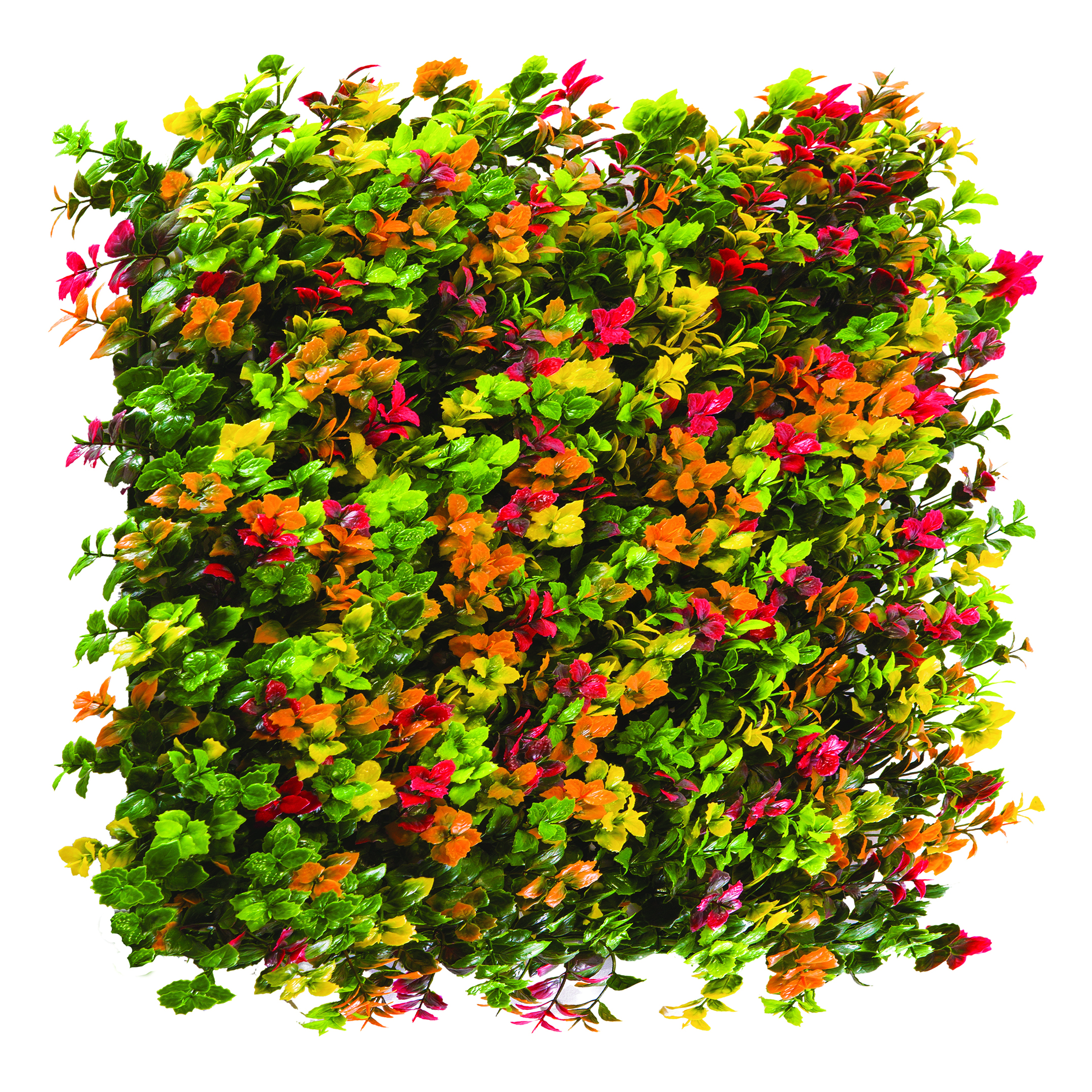 Pannello modulare per giardini verticali. Con foglie multicolore, nelle tonalità di giallo, rosso, arancione e verde che ricordano i paesaggi tipici del foliage. Realizzato in polietilene, pieno e rigoglioso, altamente verosimigliante. Indicato per giardini verticali, per interni ed esterni, piccoli e grandi spazi. Molto decorativo, perfetto per valorizzare qualsiasi ambiente, come verde verticale e orizzontale o come elemento di design. Il retro del pannello è composto da una griglia in plastica facilmente agganciabile ad altri moduli per ottenere la misura desiderata. Il pannello è flessibile è può essere posato su pareti piane, su superfici curve o colonne. Trattato per resistere ai raggi UV, dura a lungo senza scolorire. Il pannello misura 1x1 m.