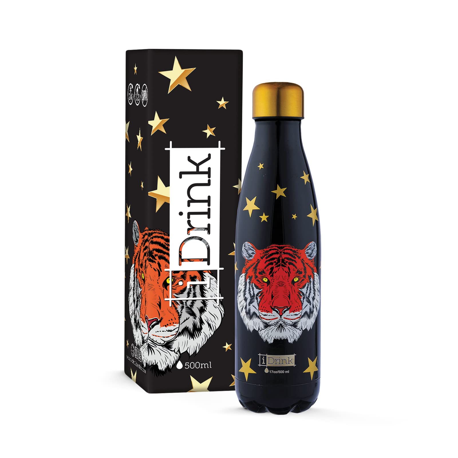 IDRINK® - Bottiglia termica rivoluzionaria, 2 pareti, bottiglia in acciaio inossidabile, 500 ML TIGER