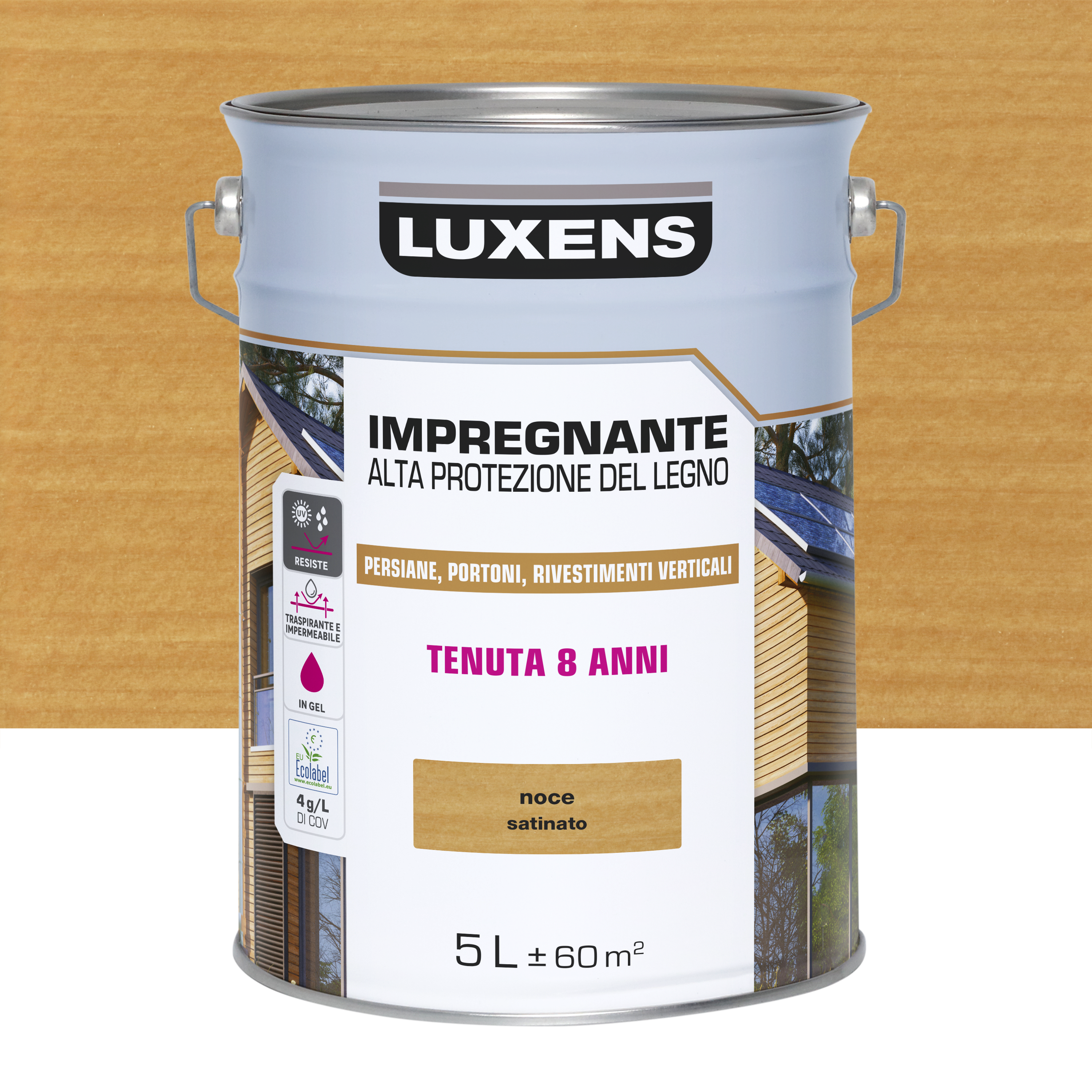 Impregnante per legno da esterno a base acqua LUXENS Alta Protezione noce chiaro satinato 5 lt, 8 anni di protezione.