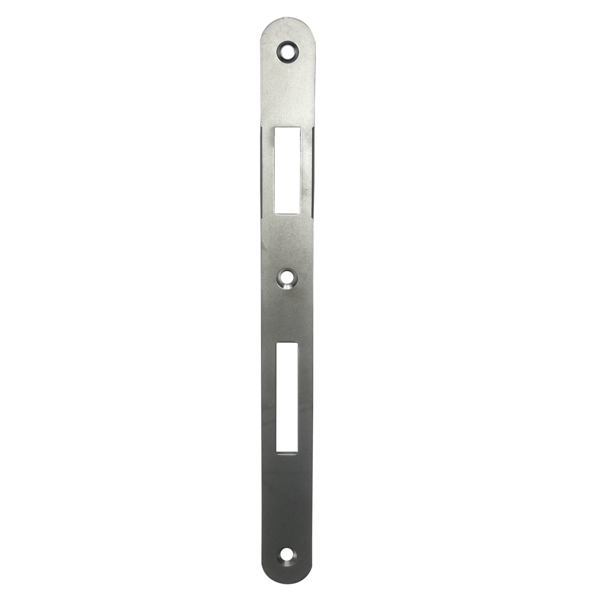 Incontro per patent interasse 90 mm, in acciaio color cromo satinato, bordo tondo. Dimensioni: H 238 x Sp 2 x L 22 mm