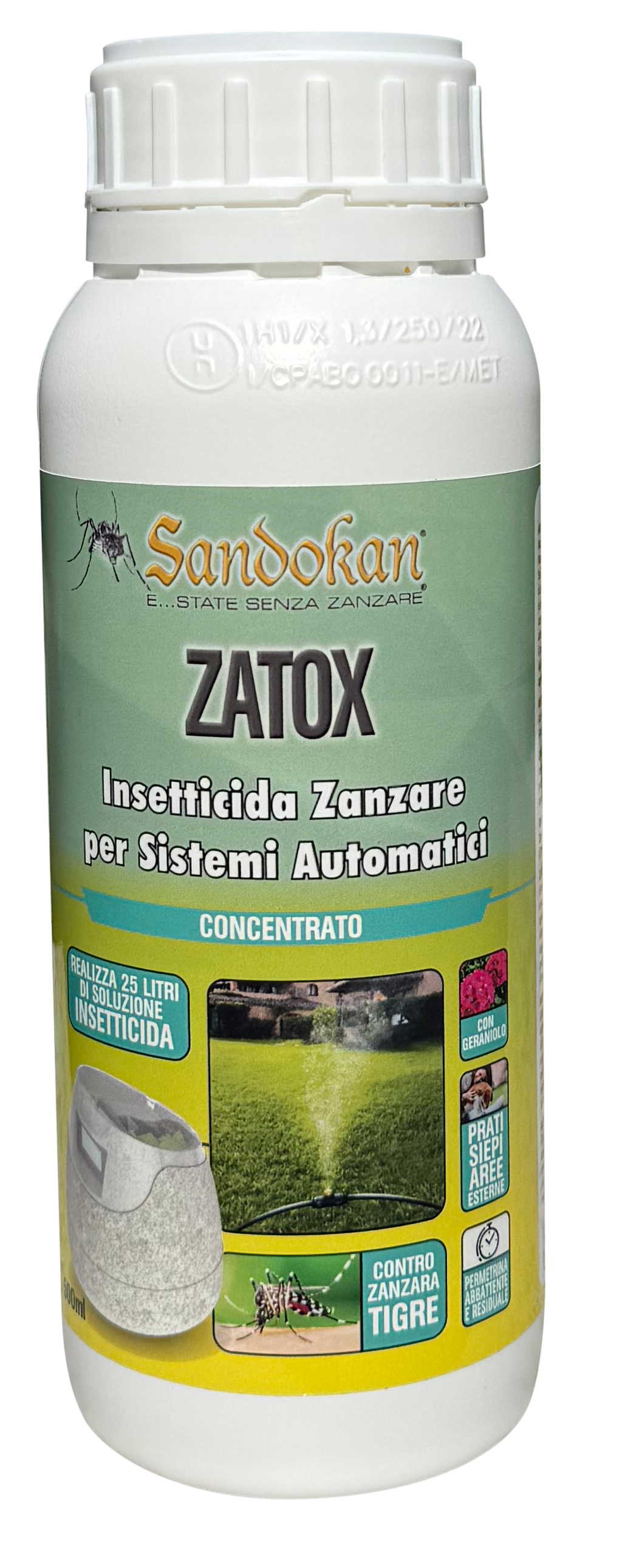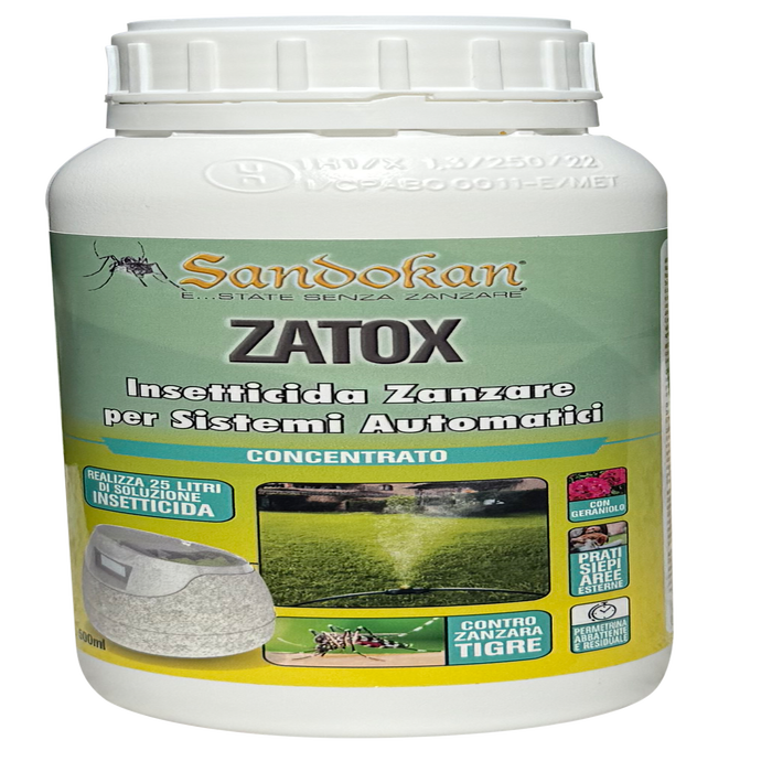 SANDOKAN INSETTICIDA CONCENTRATO 500ML PER AUTOMIZER E IMPIANTI ANTIZANZARE AUTOMATICI, utilizzabile con sistemi di nebulizzazione. L’insetticida ha un’azione abbattente e residuale con Permetrina e Geraniolo. Sandokan Insetticida Zatox Concentrato è idoneo all’utilizzo con Impianti e sistemi automatici Anti Zanzare. Come il sistema Automizer Sandokan di nebulizzazione.Sandokan Insetticida Zatox Concentrato è idoneo all’utilizzo con Impianti e sistemi automatici Anti Zanzare. Come il sistema Automizer Sandokan di nebulizzazione. CAMPI DI IMPIEGO?Il prodotto può essere impiegato sul verde ornamentale (prati, cespugli, siepi, viali alberati) per il solo controllo delle zanzare. Il prodotto può essere utilizzato sia all’interno che all’esterno, intorno agli edifici, e sul verde ornamentale. Igiene pubblica: abitazioni private, ambienti rurali, aree urbane e suburbane, luoghi pubblici e turistici, Horeca, ospedali, mezzi di trasporto, stazioni, ecc. Attività produttive: industriali, inclusi magazzini e locali di lavorazione degli alimentari, agricole e nei ricoveri di animali (canili, gattili, cucce). ?MODALITÀ D’USO?Diluire il prodotto in acqua al 2 % (20 ml per 1 L di soluzione). Distribuire la soluzione ottenuta tramite pompe manuali, sistemi automatici, atomizzatori, nebulizzatori ULV, ecc. Contro zanzare e pappataci applicare 1 L di prodotto diluito su 100 m2 di superficie direttamente sulla vegetazione, provvedere ad un’uniforme bagnatura, evitare lo sgocciolamento. Contro cimici distribuire 1 L di soluzione su 10m2 di superficie. Contro pulci e zecche distribuire 1 L di soluzione su 30m2 di superficie. Le dosi indicate sono efficaci per il trattamento delle superfici non porose.