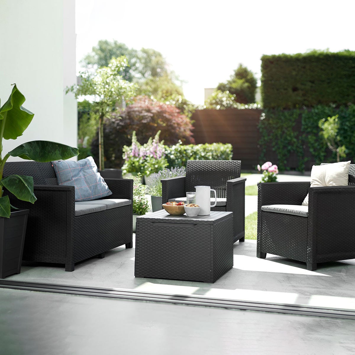 Keter Set da esterni Emma con cuscini, 2 poltrone, 1 divano e un tavolino contenitore, Grafite