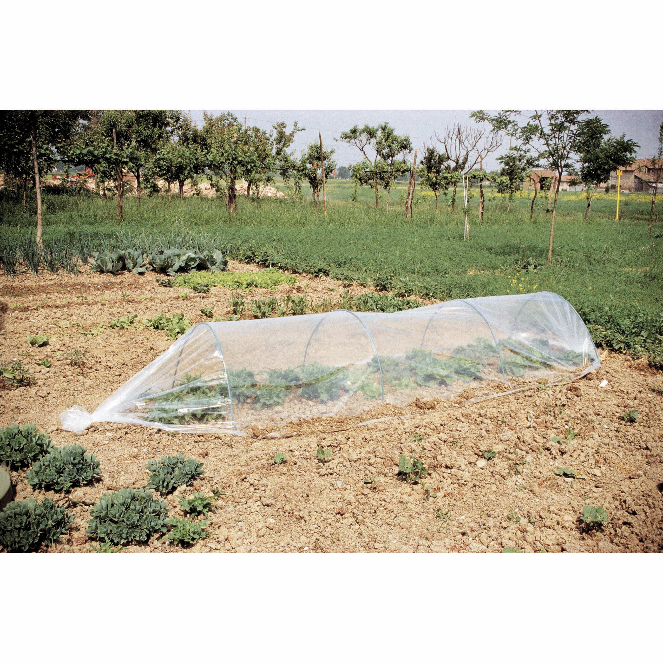 Kit tunnel per serra a tunnel. Il kit comprende 4 archi in PE e 2 picchetti per il fissaggio del telo. Materiale del telo PVC