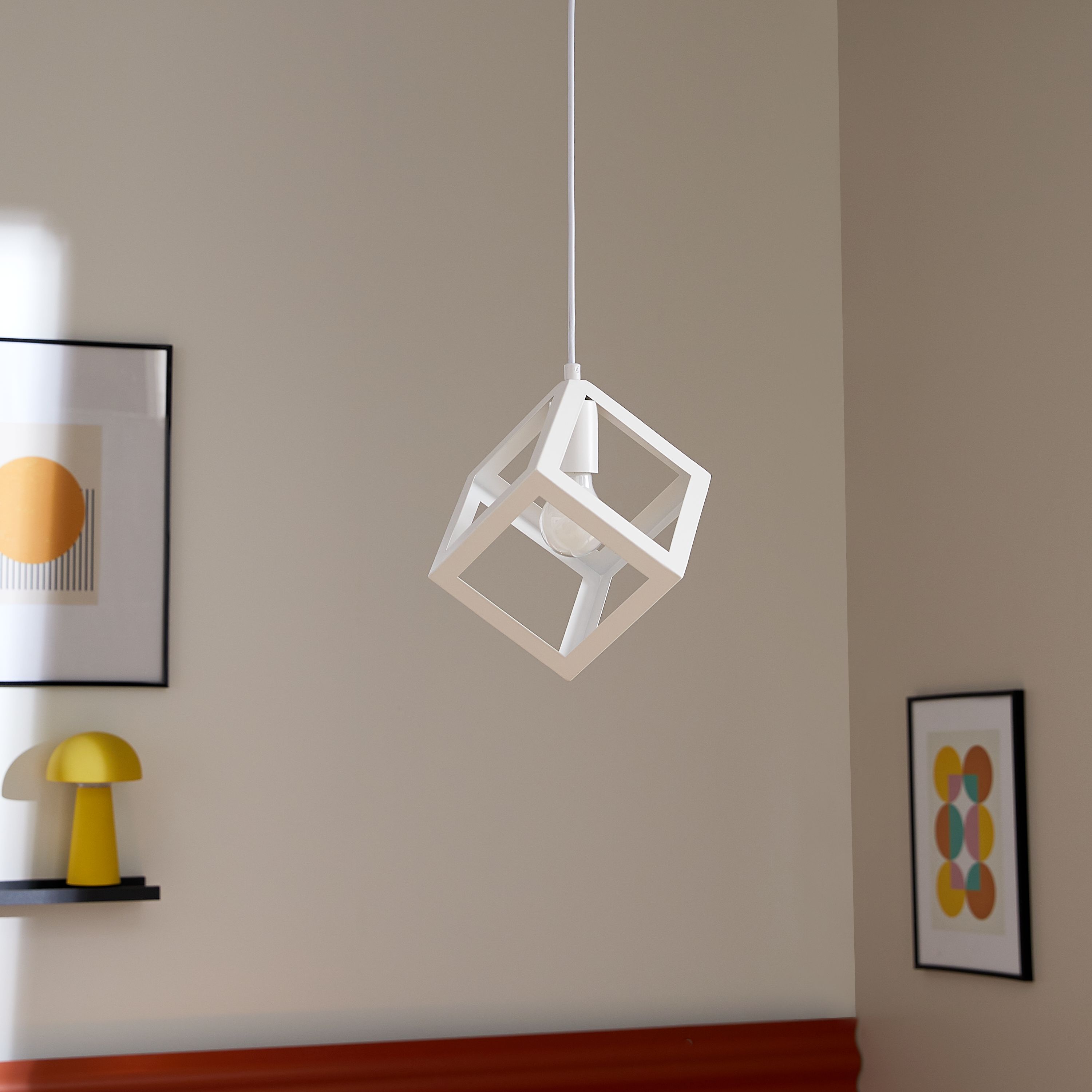 Questa lampada a sospensione PLYWOOD di INSPIRE presenta un elegante design in ferro bianco con una forma quadrata distinta, che apporta un tocco moderno e geometrico alla tua camera da letto, soggiorno o cucina.