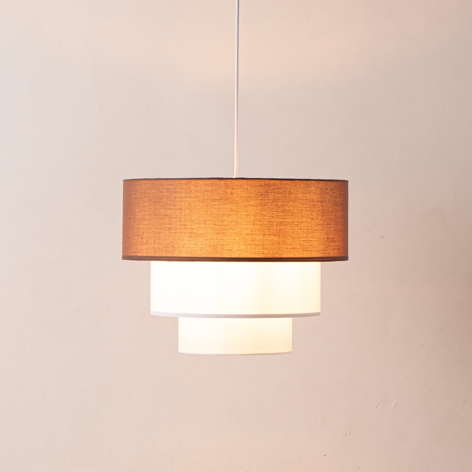 Lampada a Sospensione in Tessuto “NIVELA” a Tre Livelli in Bianco e Marrone Combinati, Ø38 cm x 30 cm, Attacco E27
