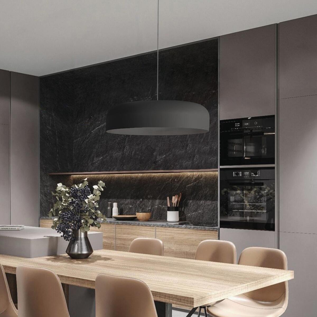 Sospensione in metallo caratterizzata da un design moderno che diffonde gradevolmente la luce. Verniciata in colore nero. Adatta a qualsiasi ambientazione moderna/classica. Disponibile nella versione con diametro 40 centimetri (1xE27).
