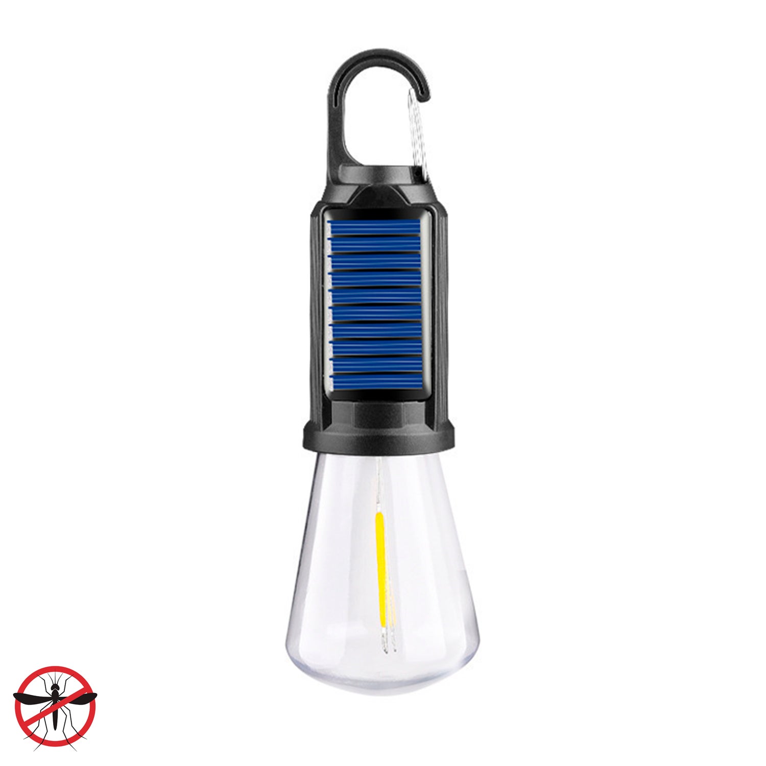 Lampadina LED T02 con carica solare e antizanzare, con gancio per appendere, batteria ricaricabile da 400mAh, 5W e luce calda fino a 12 ore di durata.