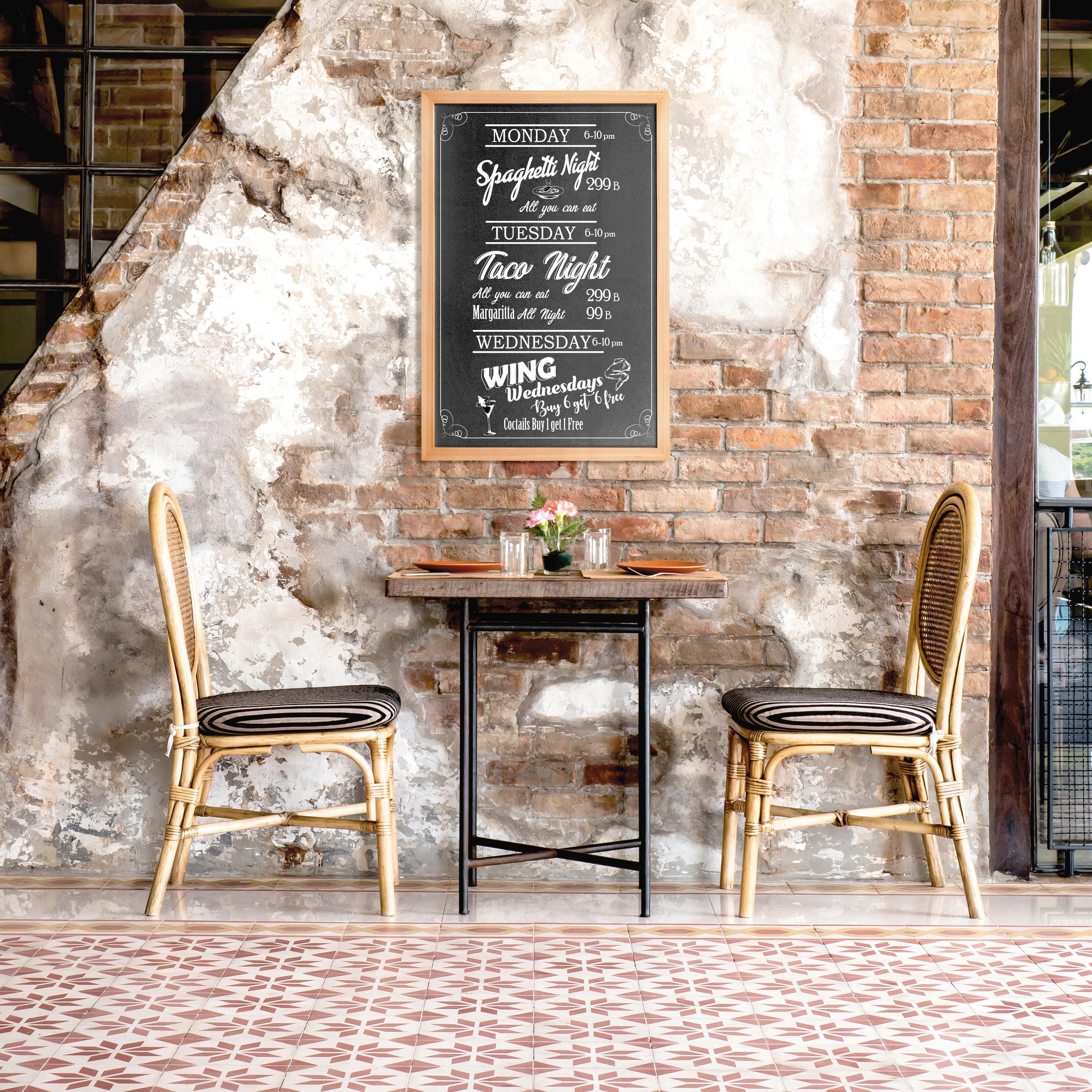 Lavagna con cornice a parete in ardesia con cornice in resina color teak, dimensioni L60 cm x H80 cm. Include un pennarello a gesso liquido bianco. La scrittura su questa lavagna è cancellabile. Ideale per lasciare messaggi, promemoria, lista della spesa, messaggi di benvenuto oppure come giocattolo creativo.