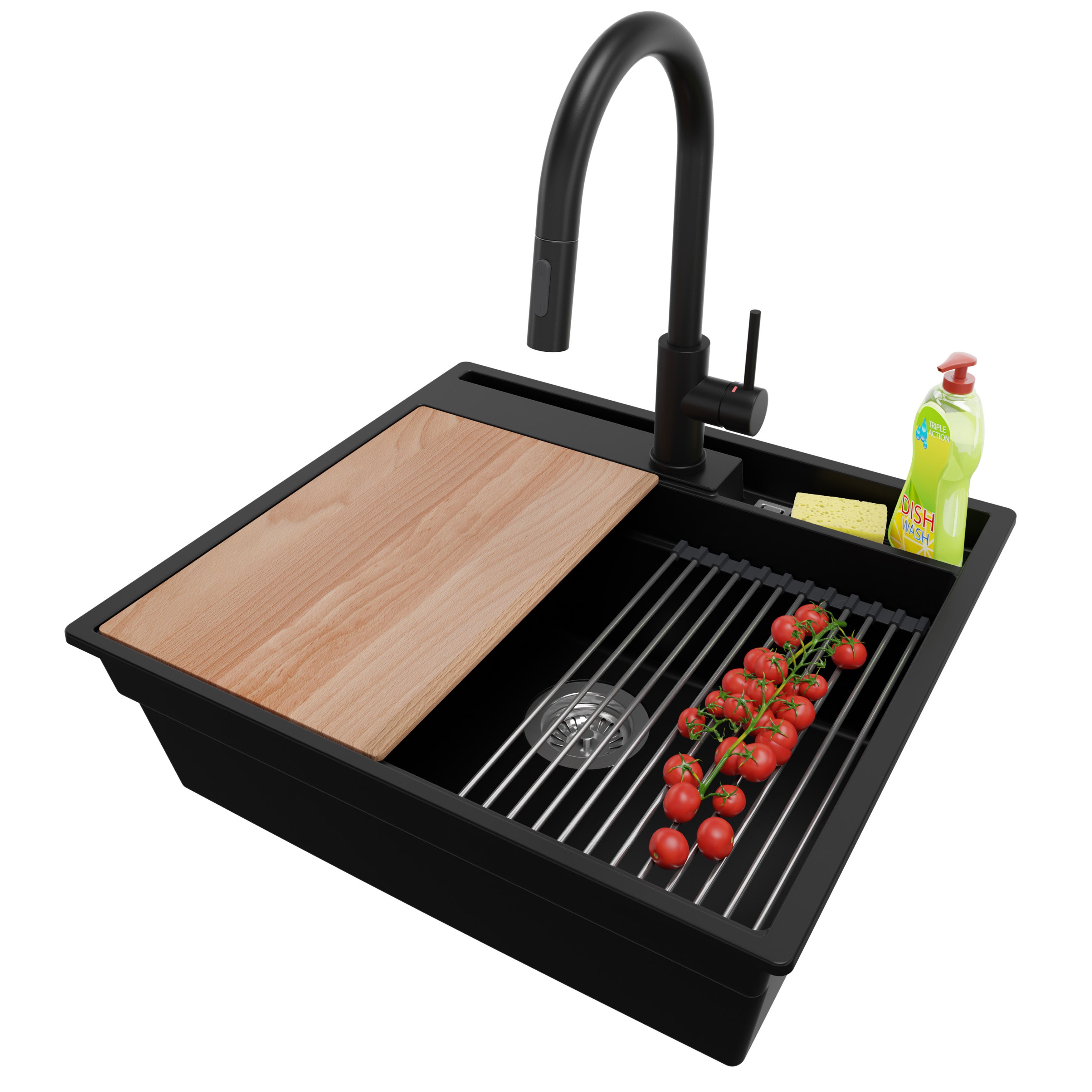 Lavello Oslo 60 Pocket Multilevel (Right), rubinetto da cucina Primagran 9010 nero con doccetta estraibile e 2 tipi di getto, set completo di scarico (sifone di alta qualità, troppo pieno, scarico aggiuntivo per lavatrice o lavastoviglie), tubi di collegamento 3/8” da 400 mm, doppi anelli di tenuta, Scolapasta avvolgibile, Tagliere.