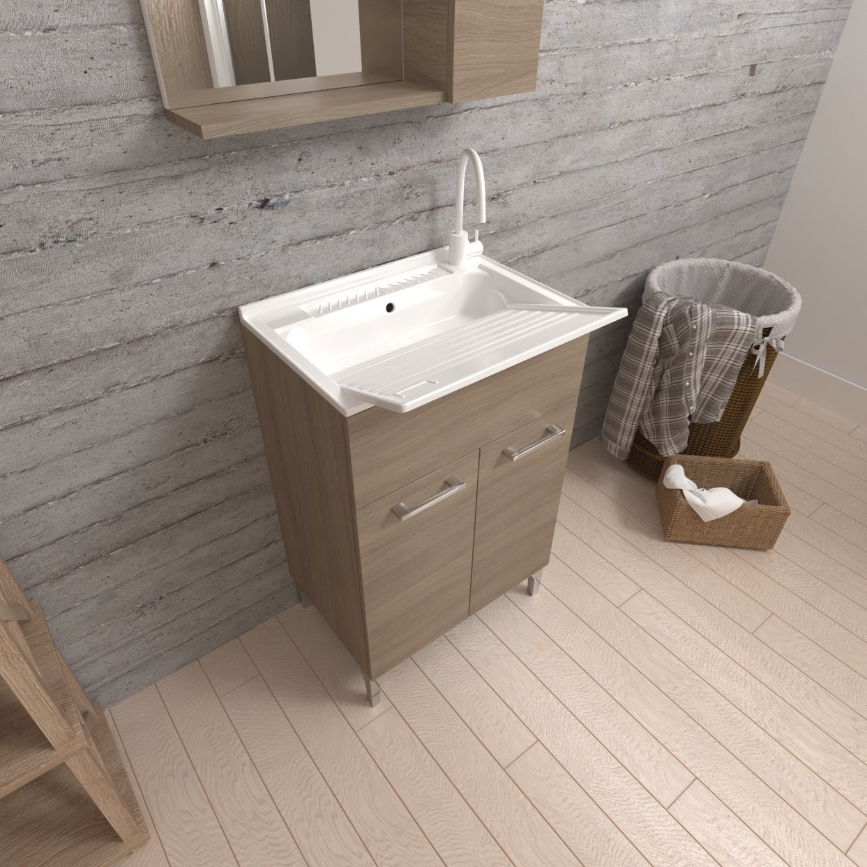 MOBILE LAVATOIO 50X50 EFFETTO LEGNO QUERCIA NATURALE CON TAVOLA LAVAPANNI RIMOVIBILEAnche la zona lavanderia cambia aspetto grazie alle nuove finiture effetto legno. Un tocco di tendenza anche in un ambiente essenzialmente di servizio.