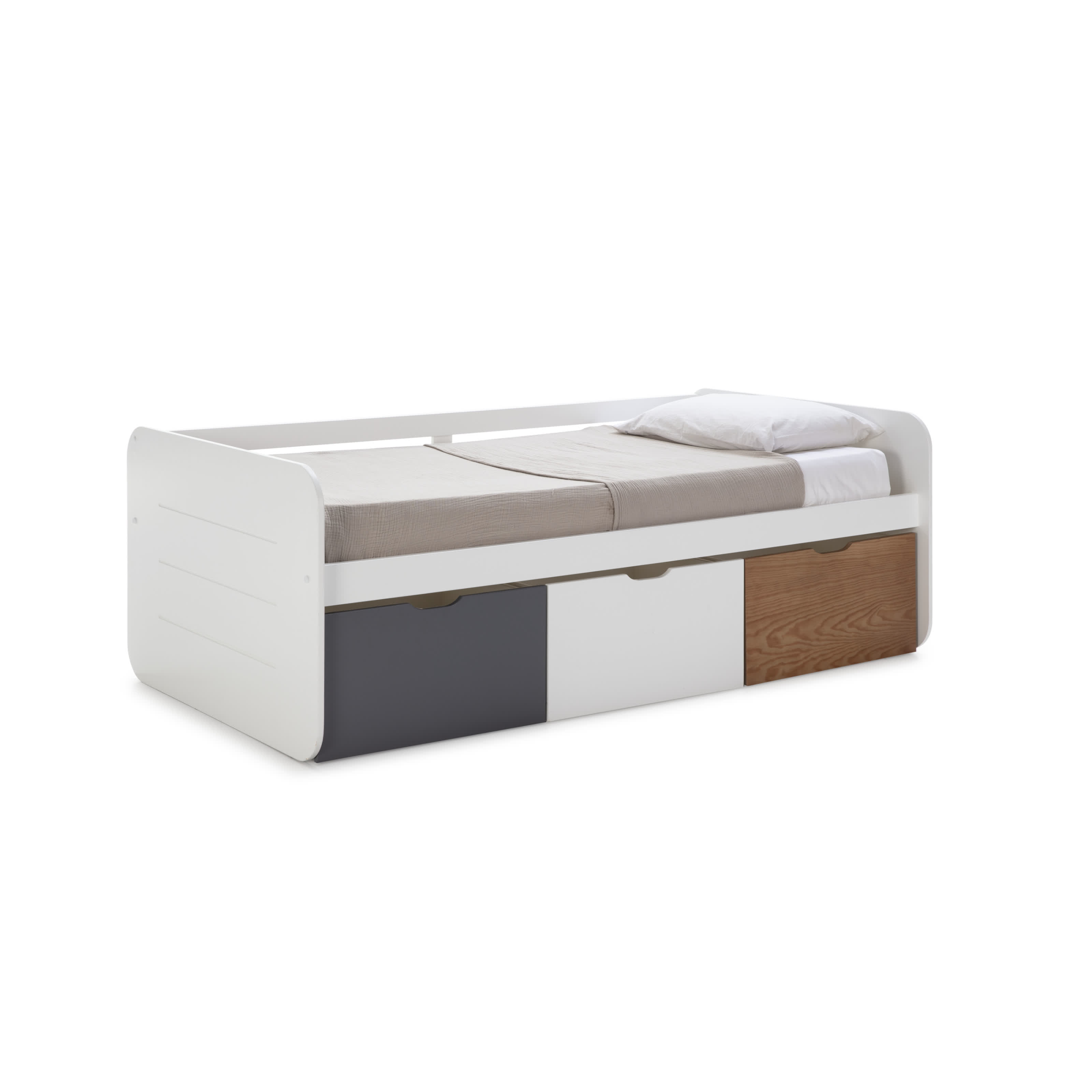 Il letto è un modello versatile e pratico, progettato per adattarsi perfettamente a camere moderne e funzionali. Questo letto singolo offre uno spazio di riposo confortevole e una struttura robusta con bordi arrotondati che aggiunge sicurezza e uno stile morbido ed essenziale. La caratteristica principale del letto è la sua base contenitore con tre ampi cassetti colorati, ideali per riporre biancheria, giochi o altri oggetti. Materiale Struttura in MDF. Colori disponibili Bianco con cassetti color blu, bianco e rovere Montaggio Il prodotto è facile da montare grazie al kit incluso.