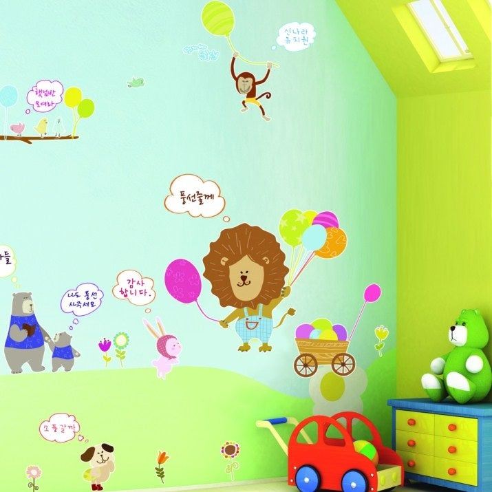 Make a funny decoration with this Lion and animals with white board parts wall decal Very quick and easy to use. No paint, no tool, no sticky paste necessary. Just peel and stick the wall decal to any smooth surface. It can be removed without any wall damage. ONE SIZE This sticker is made of separate stickers on a support board with dimensions 50 x 70 cm The lion Height measures approximately 30 x 25cm in Lenght. The bubbles are on whiteboard material for writing with felt can Veleda.