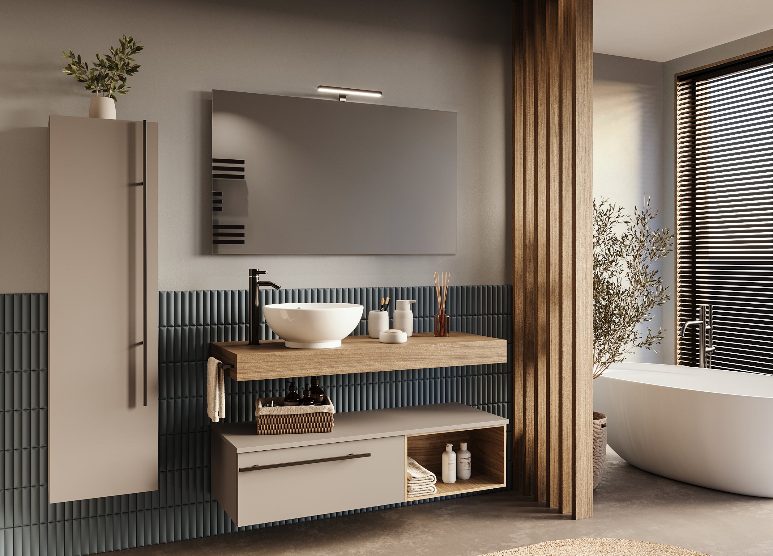 Mobile bagno Top con lavabo in appoggio vano poro noce cassettiera e colonna tortora milano specchio lampada e p.asciugamano L 120 x P 46