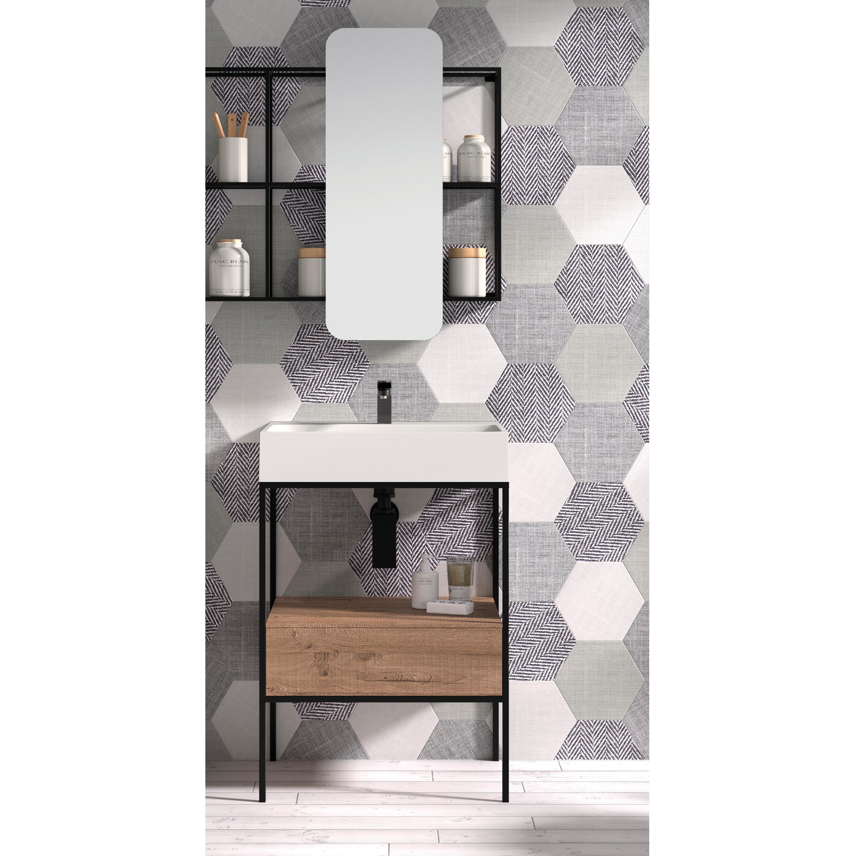 Mobile da bagno in metallo spazzolato e tinto nero. Ha un cassetto DMF in legno con sistema di apertura "push", e un ripiano sotto il lavello, uno spazio di contenimento extra ideale per i piccoli spazi. Le misure dei mobili sono 60x77x45 cm (larghezza x altezza x profondità). Lavello non incluso.