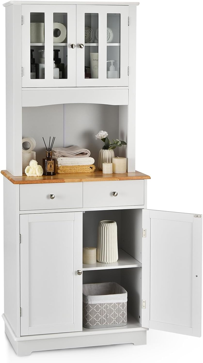 Mobile dispensa da cucina autoportante, Buffet con Piano in Legno, Credenza e 2 Cassetti, Ripiani Regolabili, Armadietto con Ante in Vetro, Sp