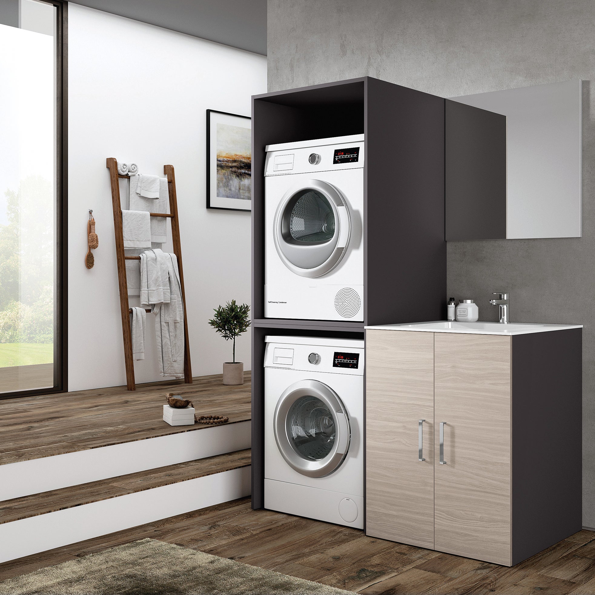 Composizione Desi olmo Rousseau L.140 H.200 P.68 cm: base porta-lavabo grigio ombra con ante olmo Rousseau, top acrilico con lavatoio centrale, moduli porta-lavatrice e porta-asciugatrice grigio ombra, specchio a muro 70 x 70 cm.