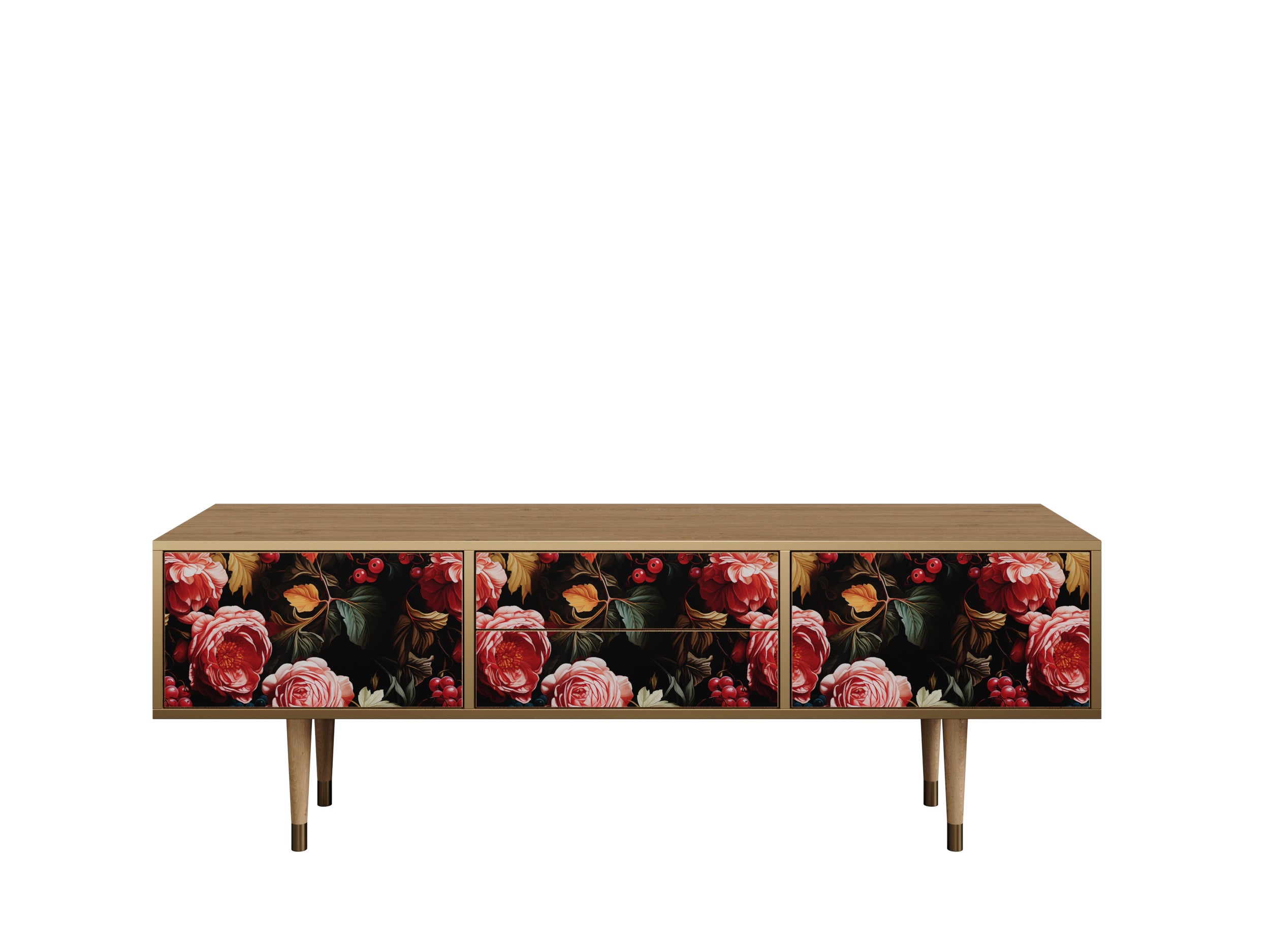 La moderna TV tomba presenta un design unico che valorizza il vostro arredamento e la vostra personalità. Grazie all'innovativa tecnologia di stampa UV, offriamo una vasta gamma di opere d'arte esclusive, perfette per le vostre esigenze. La stampa utilizza inchiostri di alta qualità, caratterizzati da una notevole resistenza sulla superficie del prodotto. Inoltre, l'immagine è protetta da un robusto rivestimento opaco di un noto produttore di vernici ecologiche. La tomba è realizzata con materiali di alta qualità, che riproducono in modo impeccabile le tonalità del noce, del rovere e dell'antarctica. I bordi frontali sono adornati con nastri in rame per la versione in noce e in ottone per quella in rovere, evidenziando l'eleganza di questo mobile. Le gambe della TV tomba sono realizzate in legno naturale, verniciate per abbinarsi al corpo del mobile e protette da anelli in rame o ottone per prevenire danni durante le pulizie. L'altezza della tomba facilita le operazioni di pulizia dell'ambiente, consentendo al vostro robot aspirapolvere di rimuovere la polvere senza difficoltà. Questo mobile è dotato di due ante e due cassetti, che si aprono tramite un sistema push.