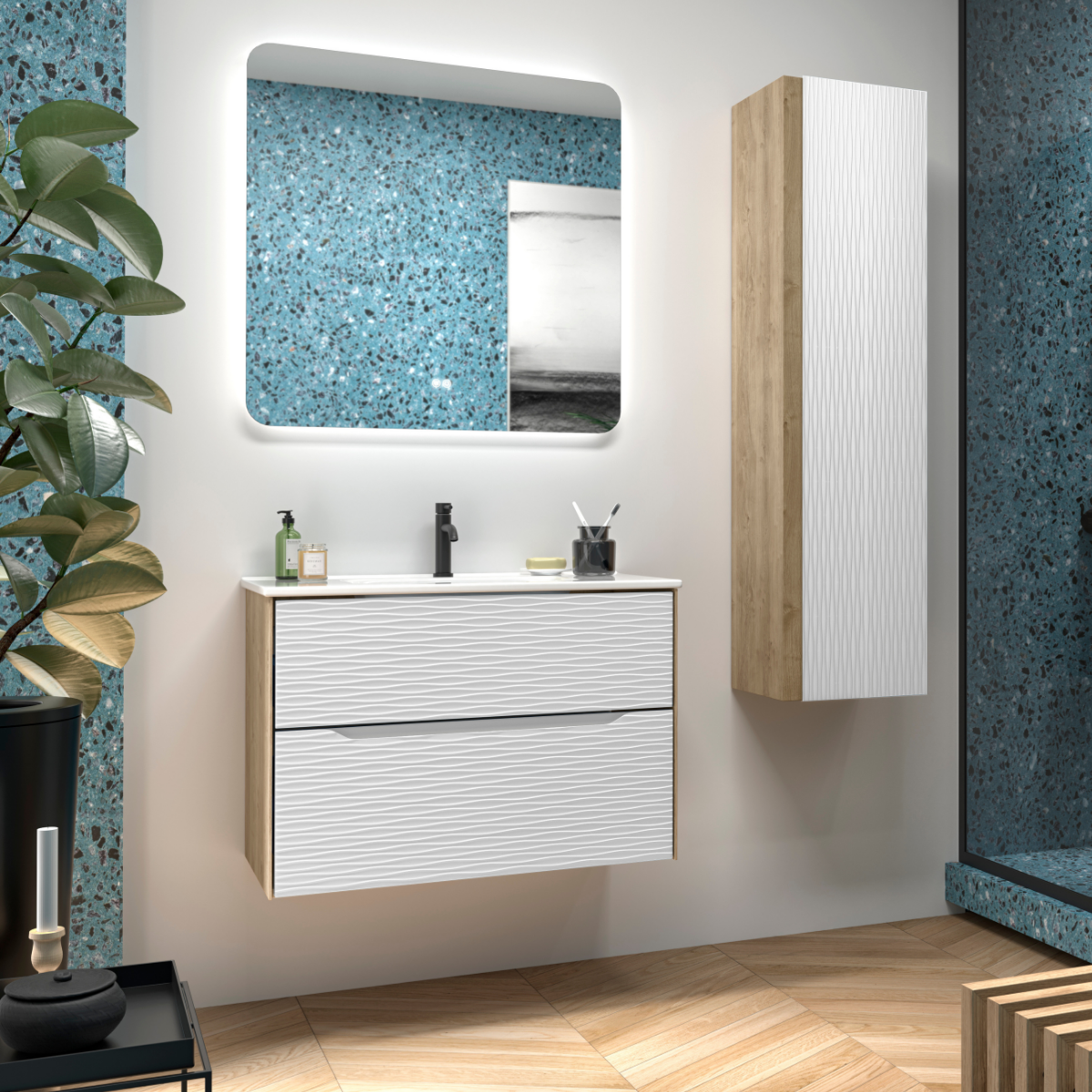 Mobile da Bagno Sospeso con 2 Cassetti più Lavabo in Ceramica. Il cassetto superiore è dotato di organizzatore e salva-sifone, mentre il cassetto inferiore offre la massima capacità di stoccaggio. I frontali dei cassetti sono regolabili in orizzontale e verticale, con guide Grass che garantiscono scorrimento fluido e chiusura ammortizzata. Questo mobile da bagno ha una presa a gola nel cassetto inferiore che, in base alla posizione della mano, consente di aprire il cassetto superiore o inferiore.
