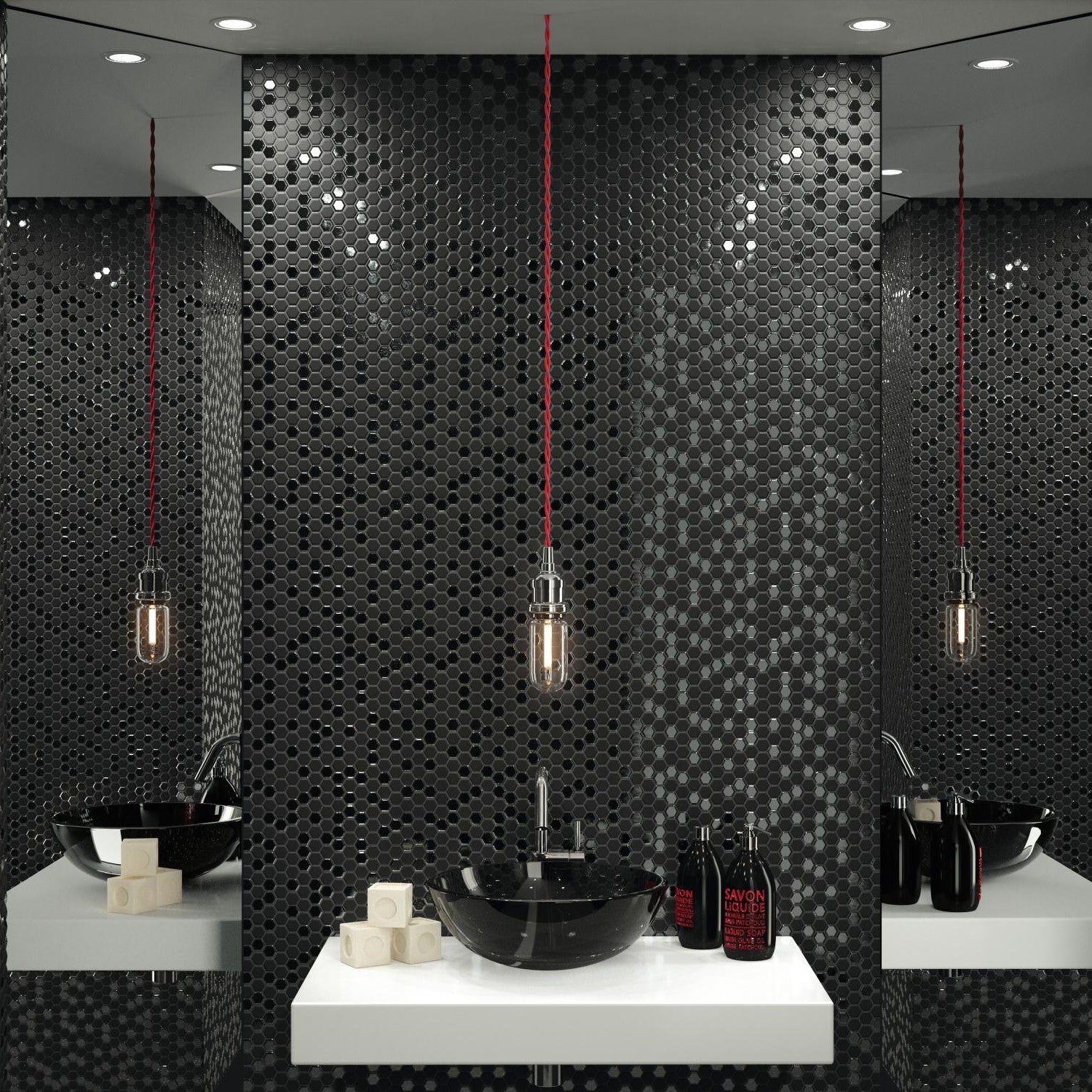 Mosaico esagonale minimalista ma con un tocco di glamour grazie alle sue tessere brillanti. Può essere posato sia sul pavimento che sulla parete della doccia, ma si raccomanda di non posarlo sul pavimento del resto della casa per evitare di graffiare le tessere brillanti