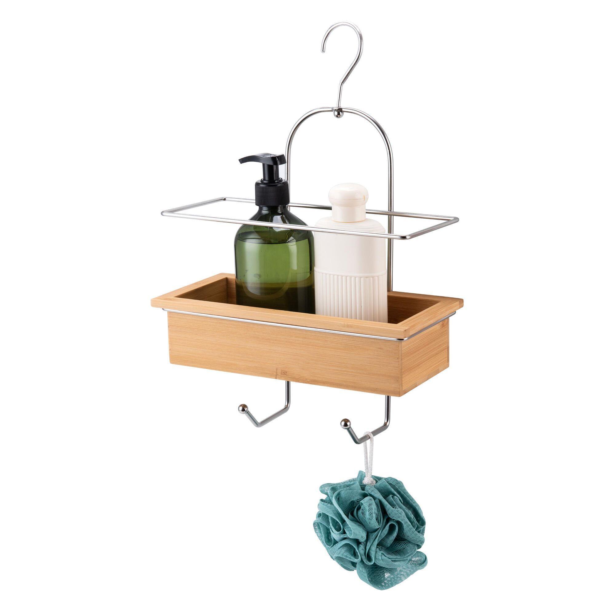 Dotato di uno spazioso cestino in bambù con barra di supporto per contenere bottiglie di grandi dimensioni, questo ripiano organizza in modo efficiente i tuoi prodotti per la doccia. I due ganci integrati permettono di appendere accessori come un fiore da doccia, un guanto o una spazzola, per un utilizzo ancora più funzionale.