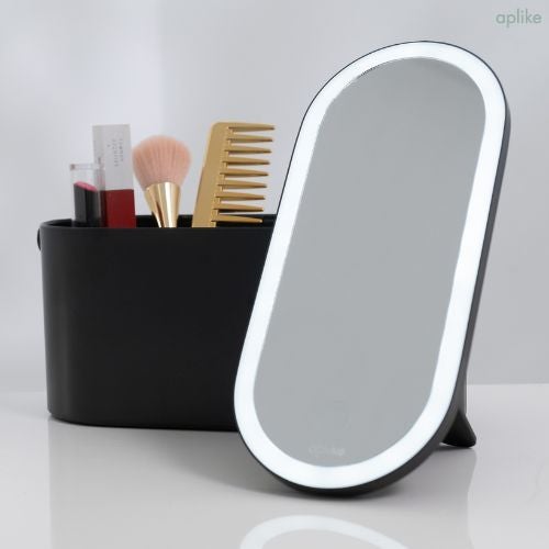 Organizzatore per il trucco con specchio e luce LED fredda 8000K incorporata. Questo porta trucchi di design è disponibile in 4 colori: acquamarina, rosa, bianco opaco e nero opaco. È dotato di illuminazione a LED ad alta efficienza energetica. Include una striscia da 60 LED/m che fornisce una luce bianca fredda da 8000K, perfetta per il trucco dettagliato e la routine del viso. Fornisce una luminosità di 40 lumen con un consumo energetico efficiente di soli 3W. Illuminazione diretta, uniforme e senza ombre. È dotata di un pulsante di accensione a sfioramento. Tenendo premuto questo pulsante per alcuni secondi, è possibile regolare l'intensità della luce per scegliere la potenza desiderata in qualsiasi momento. Lo specchio può essere collocato in diverse posizioni, sia attaccato al box organizzatore che su un tavolo o una toeletta. Il suo design compatto di 23,2 cm x 11,6 cm lo rende ideale per qualsiasi tavolo da toeletta o spazio di bellezza o anche per i viaggi. Lo specchio è alimentato da una batteria 3xAAA o da un caricatore, quest'ultimo incluso. Durata della batteria alla massima potenza (luminosità) = 5 ore e alla minima potenza (luminosità) = 100 ore. Realizzato in policarbonato, polistirolo e vetro. Il suo design ECO è privo di piombo e rame, con certificazione IP20. Con una garanzia di 5 anni*.