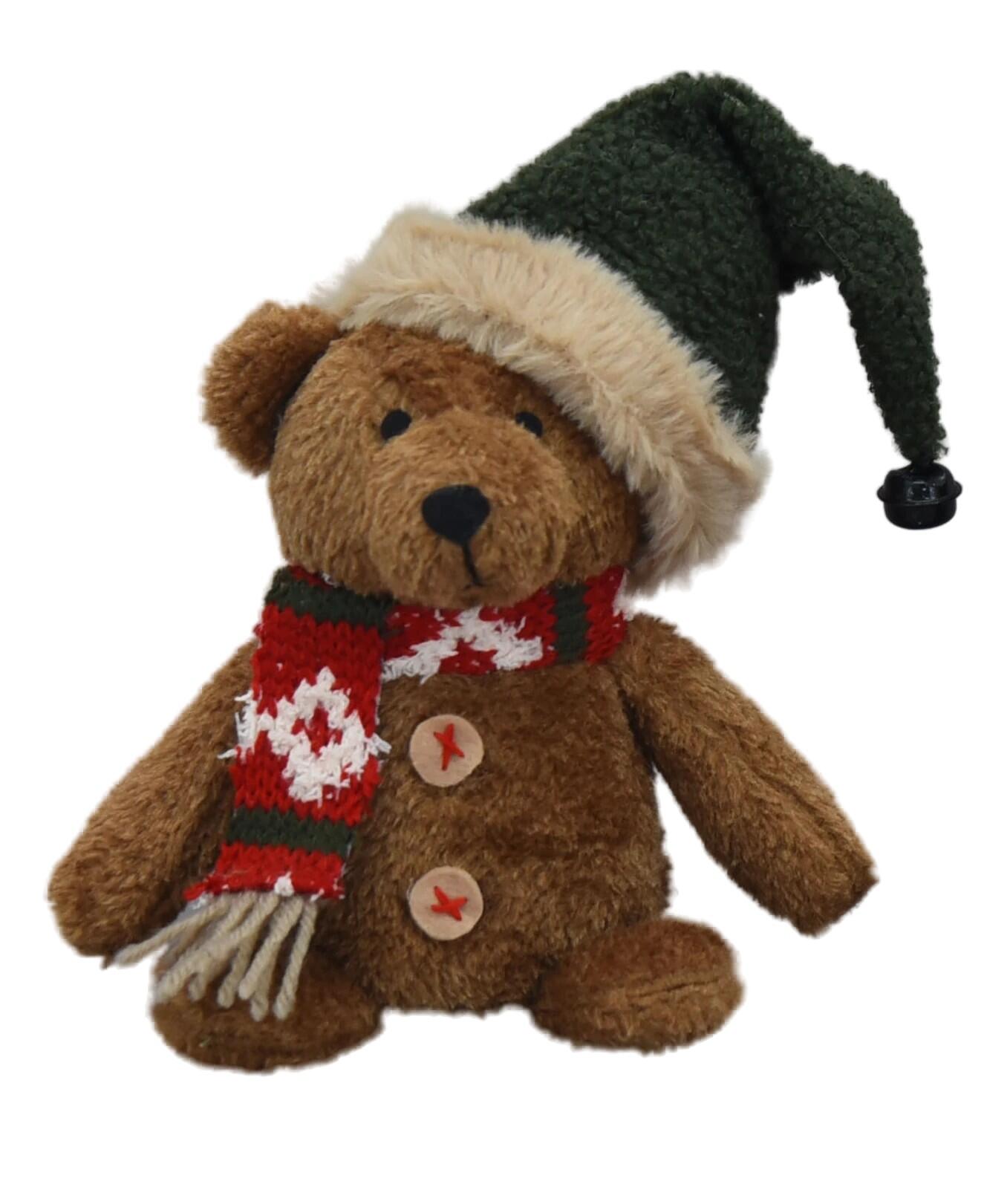 Orso decorativo in poliestere con cappello natalizio e sciarpa, misura 15x12x18 cm, perfetto per creare un'atmosfera calda e festosa.