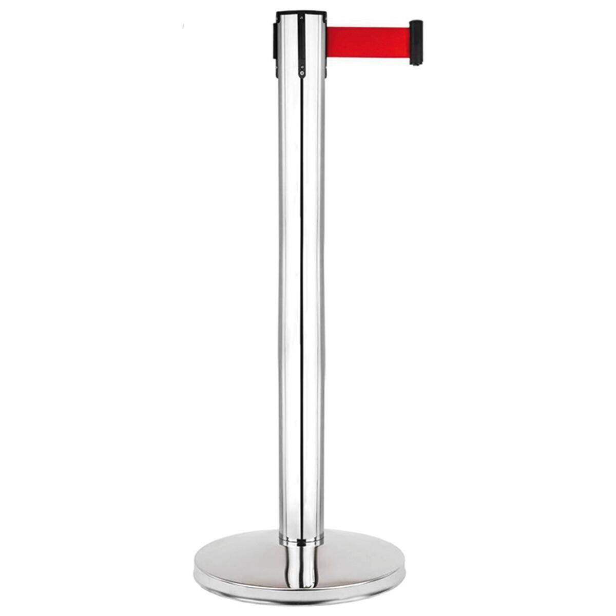 Paletto in metallo con nastro rosso da 3 metri estensibile e retrattile. Realizzato in metallo cromato con una base molto pesante per renderlo stabile