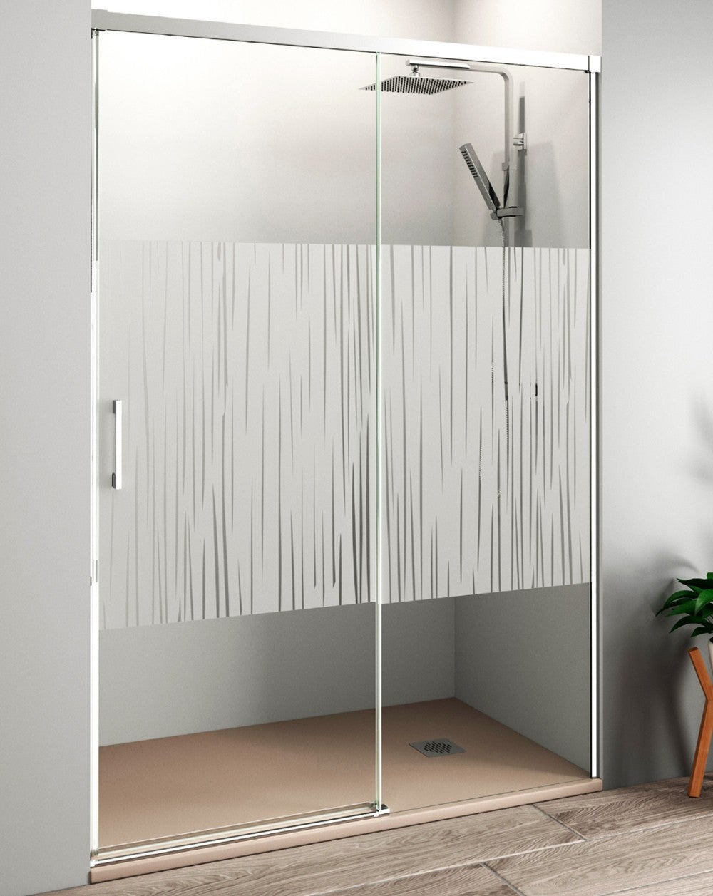 Vetro temperato da 6 mm ad alta sicurezza, a scelta trasparente o serigrafato (decorato con stampa digitale) con trattamento anticalcare su entrambi i lati. L'opzione serigrafia è disponibile solo con profili cromati. Se desiderate la parete divisoria con profili neri o bianchi con serigrafia, contattateci telefonicamente o via e-mail e vi mostreremo le diverse opzioni di serigrafia e personalizzazione.