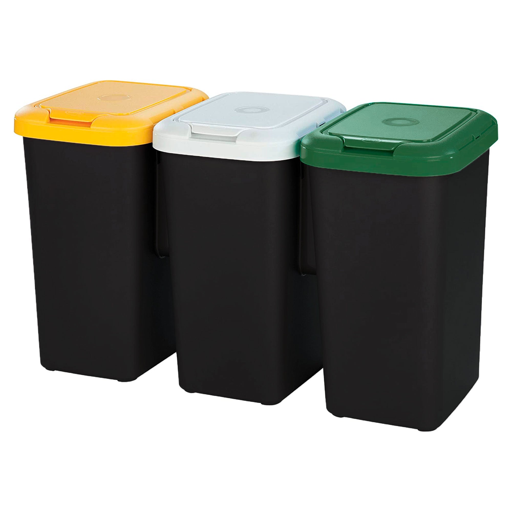 In kit da 3 pezzi. Prodotto indicato per gestire e regolare, in maniera giusta, la raccolta e la differenziazione dei rifiuti. Dotata di coperchio con apertura a pulsante. In abs antiurto. Colore nero/bianco/verde. Dimensioni e capacità riferite a singolo articolo.
