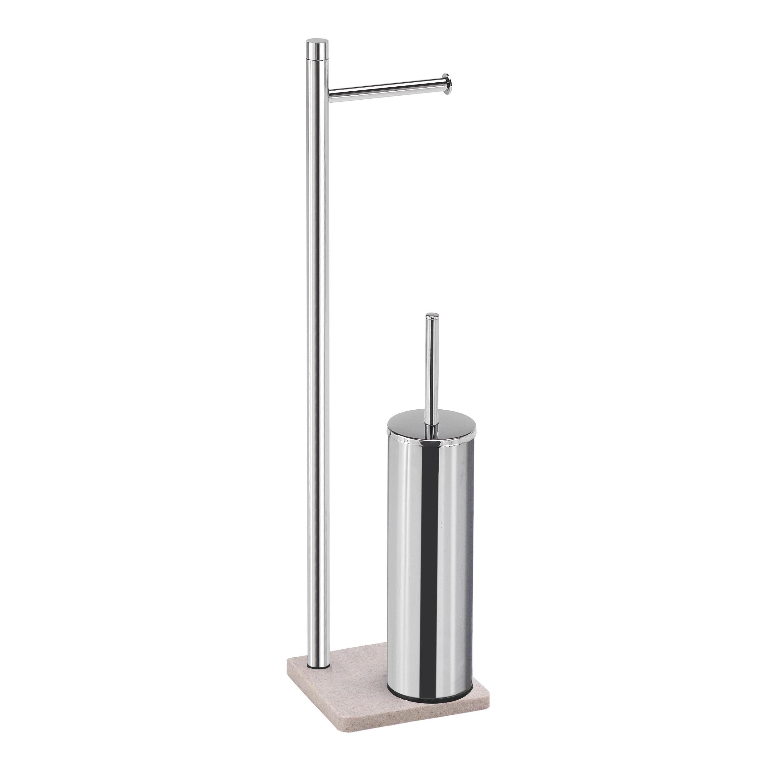 colonna portarotolo con portarotolo e portascopino in acciaio inox e finitura cromata cromo con base in resina e beige sabbia