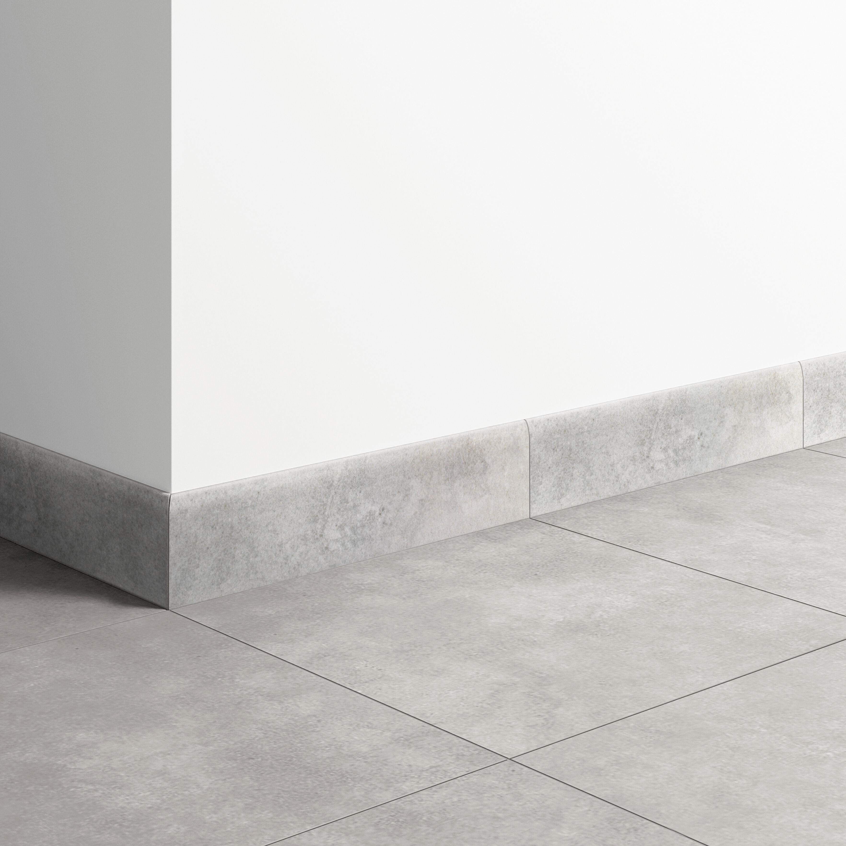 Battiscopa della serie IRIS in gres porcellanato con effetto cemento e finitura opaca. Forma rettangolare, colore grigio. Dimensioni: 33.3 x 8 cm (lunghezza x altezza), Spessore 8 mm. Una confezione da 18 pezzi.