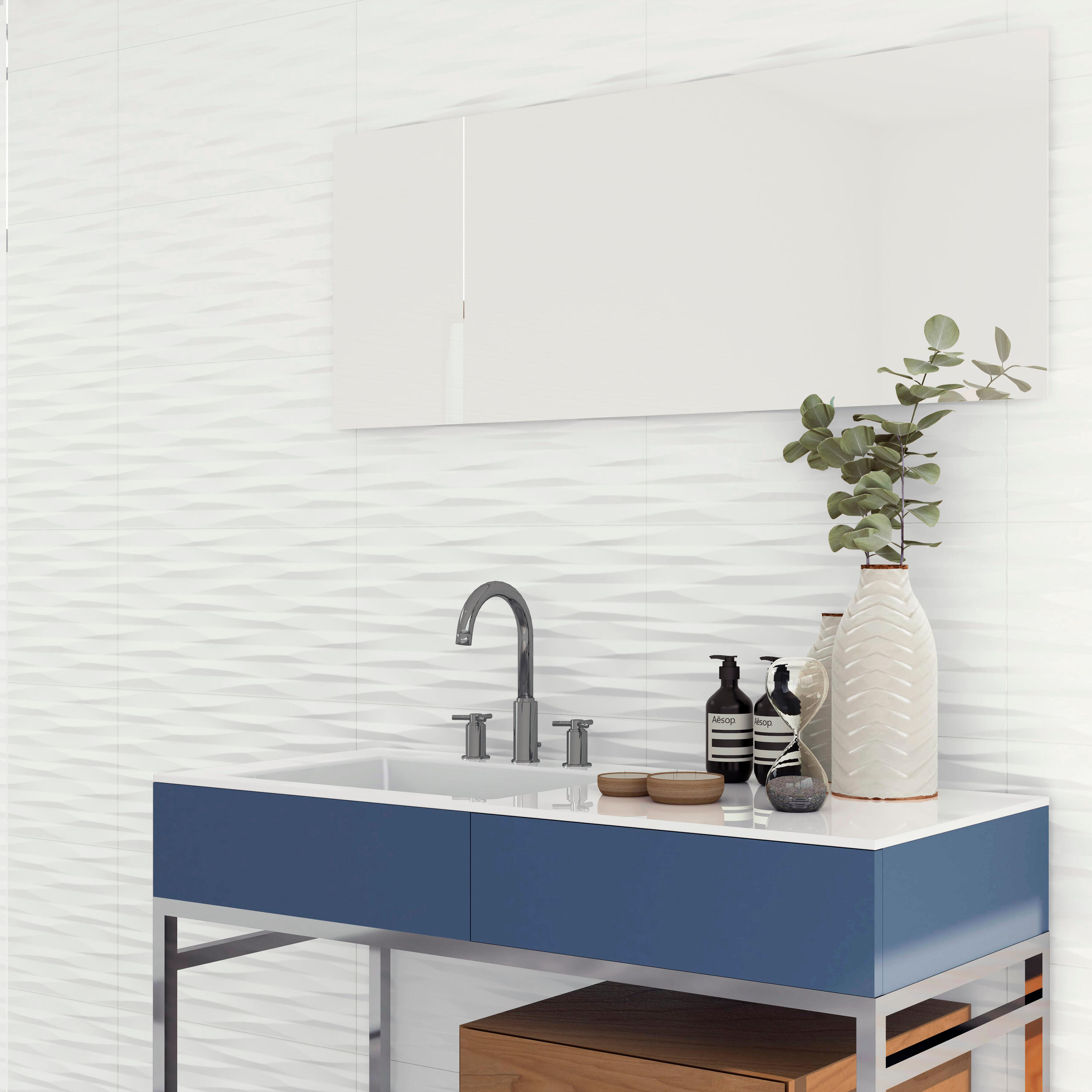 Piastrelle bianche opache, arricchite da un moderno effetto 3D di forma geometrica. Con uno spessore di soli 7,4 mm, questi rivestimenti sono leggeri da maneggiare nonostante le loro dimensioni. Bordi rettificati, per fughe da 2 mm. Pratico per l'uso quotidiano, si pulisce semplicemente con un panno umido e un prodotto neutro. Durante il taglio delle piastrelle è indispensabile indossare una maschera protettiva di tipo FFP3