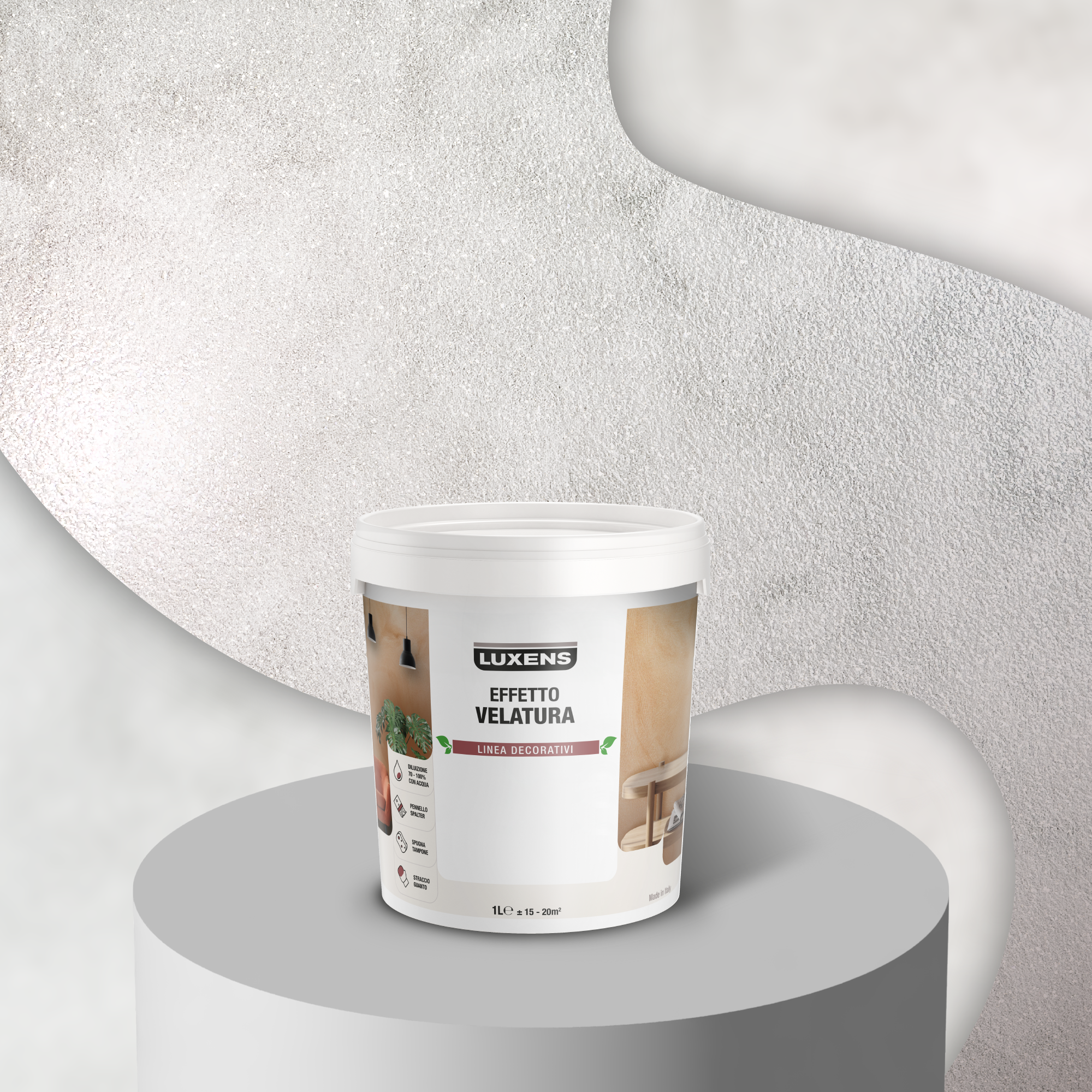 LUXENS EFFETTO VELATURA è una velatura decorativa murale per interni a base di polimeri silossanici modificati che conferiscono alla parete ottima traspirabilità, elevata idrorepellenza e permette di ottenere effetti cromatici simili ai tradizionali intonaci. Il prodotto NON è COPRENTE ma crea un film texturizzato semi-coprente sul supporto. Luxens Effetto Velatura va applicato su pareti interne già ripristinate, coese e tinteggiate con pitture per interno lavabili o superlavabili. Le pitture Luxens sono rispettose della qualità dell’aria negli ambienti interni e garantiscono un impatto minimo sull’ambiente. Made in Italy, questo prodotto contribusice allo sviluppo delle produzioni e distribuzioni locali, favorendo un minor impatto sull’ambiente grazie alla riduzione delle emissioni di CO2 nell’aria.