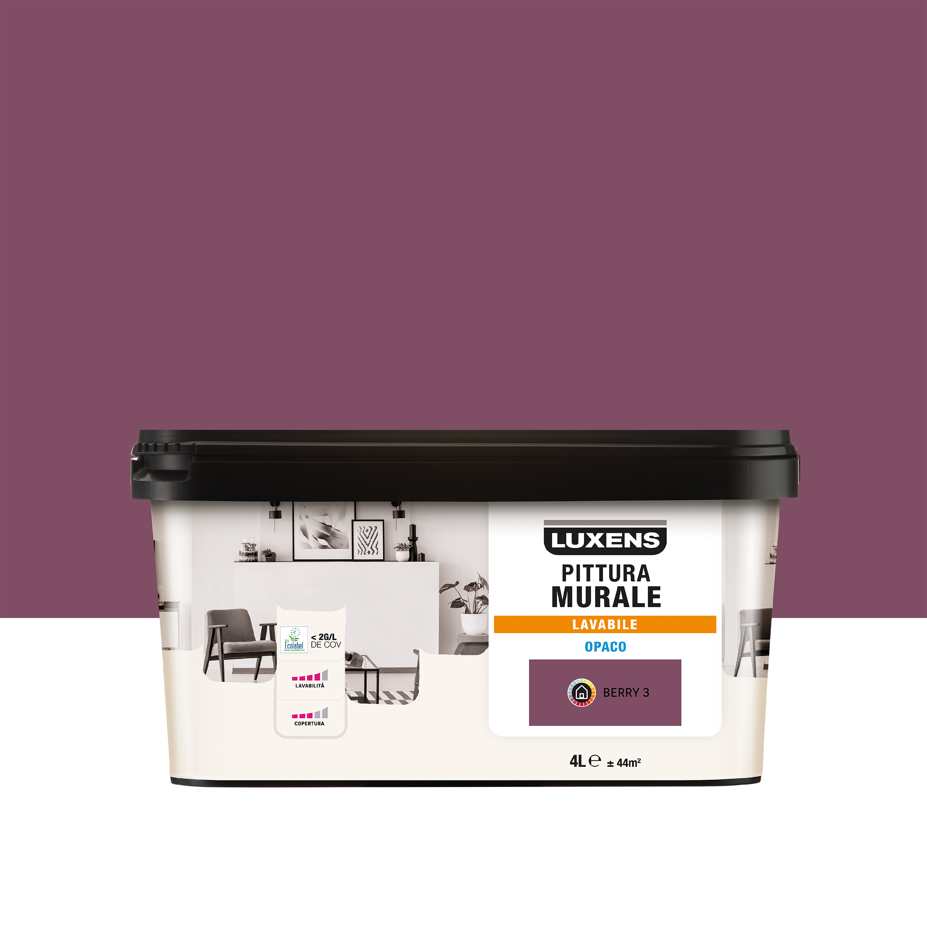 Pittura murale da interno LUXENS di colore viola berry 3. Confezione da 4 litri che permette di coprire fino a 44 metri quadrati di superficie. L'aspetto opaco maschera le imperfezioni della parete e le irregolarità dell’ambiente. Il prodotto è pronto all'uso, non necessita quindi di diluizioni. Le pitture lavabili sono ricche di resine e pigmenti, garantiscono un’ottima copertura e resistenza allo sporco e allo sfregamento. Il tempo di asciugatura è di 12 ore, ma sono sufficienti 4 ore di asciugatura tra una mano e l'altra. Trattandosi di una pittura a base acqua, eventuali gocce che cadono sulle superfici risultano facili da pulire con acqua calda. Data la composizione chimica del prodotto è sufficiente utilizzare acqua per la pulizia degli attrezzi. Disponibile campione formato 75 ML ref. 82342899.