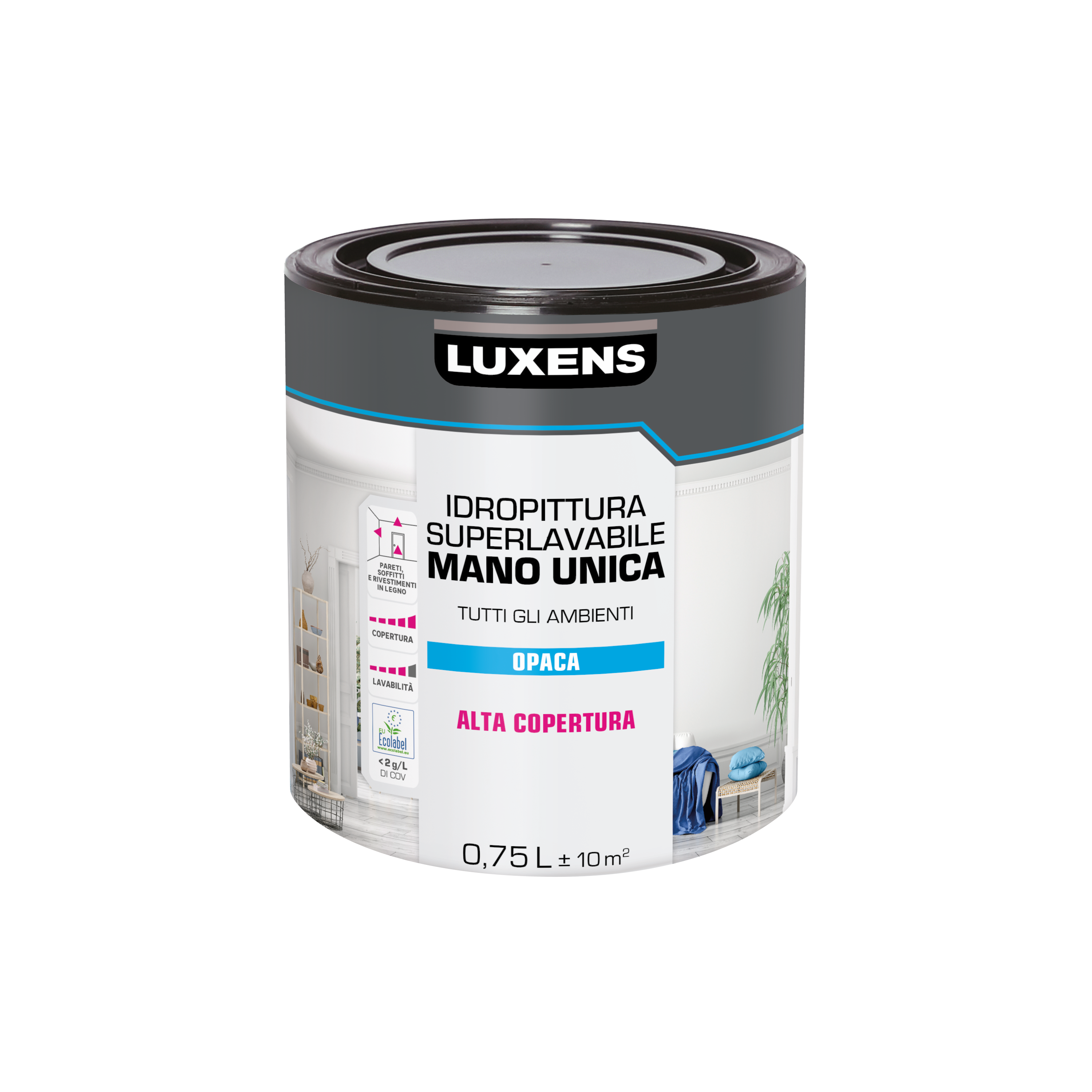 Pittura murale da interno LUXENS di colore bianco. Confezione da 0,75 litri che permette di coprire fino a 8,25 metri quadrati di superficie. L'aspetto opaco maschera le imperfezioni della parete e le irregolarità dell’ambiente. Il prodotto è pronto all'uso, non necessita quindi di diluizioni. Le pitture superlavabili sono ricche di resine e pigmenti, garantiscono un’ottima copertura e resistenza allo sporco e allo sfregamento. Sono indicate per tutti gli ambienti della casa, in particolare il soggiorno, le camere da letto e i luoghi di passaggio. È consigliata anche per bagni e cucine, se non sono eccessivamente umidi, perché consente di togliere lo sporco con un panno appena inumidito senza rimuovere la pittura. Il tempo di asciugatura della pittura è di 12 ore, ma sono sufficienti 4 ore di asciugatura tra una mano e l'altra. Trattandosi di una pittura a base acqua, eventuali gocce che cadono sulle superfici risultano facili da pulire con acqua calda. Data la composizione chimica del prodotto è sufficiente utilizzare acqua per la pulizia degli attrezzi. Certificato dal marchio di qualità ecologica Ecolabel, questo prodotto è eco-compatibile: la sua produzione, distribuzione e smaltimento, avvengono nel rispetto di elevati standard ambientali e con un ridotto impatto ambientale. Le pitture Ecolabel hanno un’emissione molto bassa, o sono totalmente prive, di sostanze volatili nocive e irritanti, e per questo sono adatte per le camere di bambini e persone allergiche.