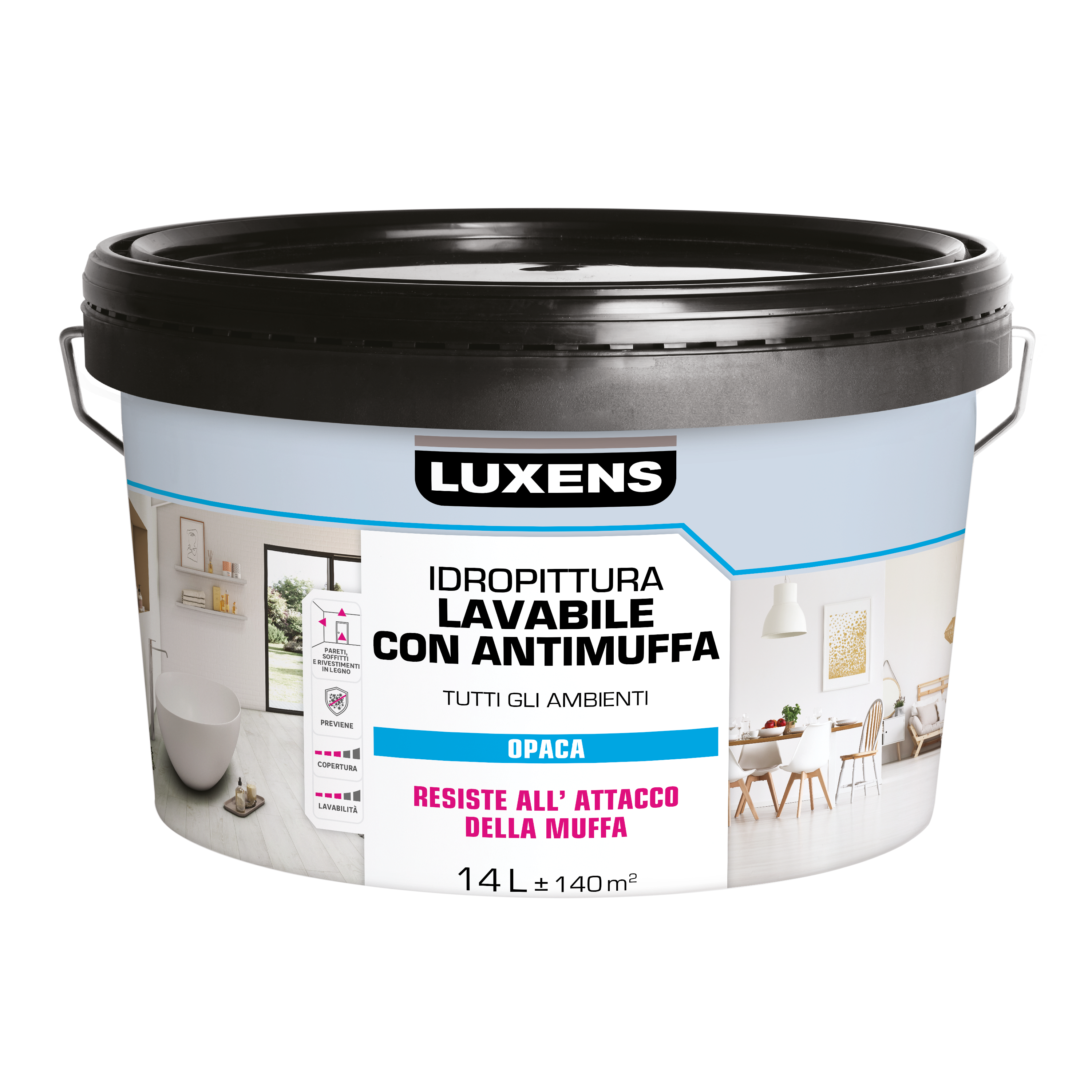 Pittura murale da interno LUXENS di colore bianco. Confezione da 14 litri che permette di coprire fino a 154 metri quadrati di superficie. L'aspetto opaco maschera le imperfezioni della parete e le irregolarità dell’ambiente. Il prodotto è pronto all'uso, non necessita quindi di diluizioni. Le pitture lavabili sono ricche di resine e pigmenti, garantiscono un’ottima copertura e resistenza allo sporco e allo sfregamento. Sono indicate per tutti gli ambienti della casa, in particolare il soggiorno, le camere da letto e i luoghi di passaggio. Grazie a pigmenti antimuffa, questa vernice è adatta ad ambienti umidi e previene la formazione di muffe sulle pareti. Il tempo di asciugatura della pittura è di 12 ore, ma sono sufficienti 8 ore di asciugatura tra una mano e l'altra. Trattandosi di una pittura a base acqua, eventuali gocce che cadono sulle superfici risultano facili da pulire con acqua calda. Data la composizione chimica del prodotto è sufficiente utilizzare acqua per la pulizia degli attrezzi. Certificato dal marchio di qualità ecologica Ecolabel, questo prodotto è eco-compatibile: la sua produzione, distribuzione e smaltimento, avvengono nel rispetto di elevati standard ambientali e con un ridotto impatto ambientale. Le pitture Ecolabel hanno un’emissione molto bassa, o sono totalmente prive, di sostanze volatili nocive e irritanti, e per questo sono adatte per le camere di bambini e persone allergiche.