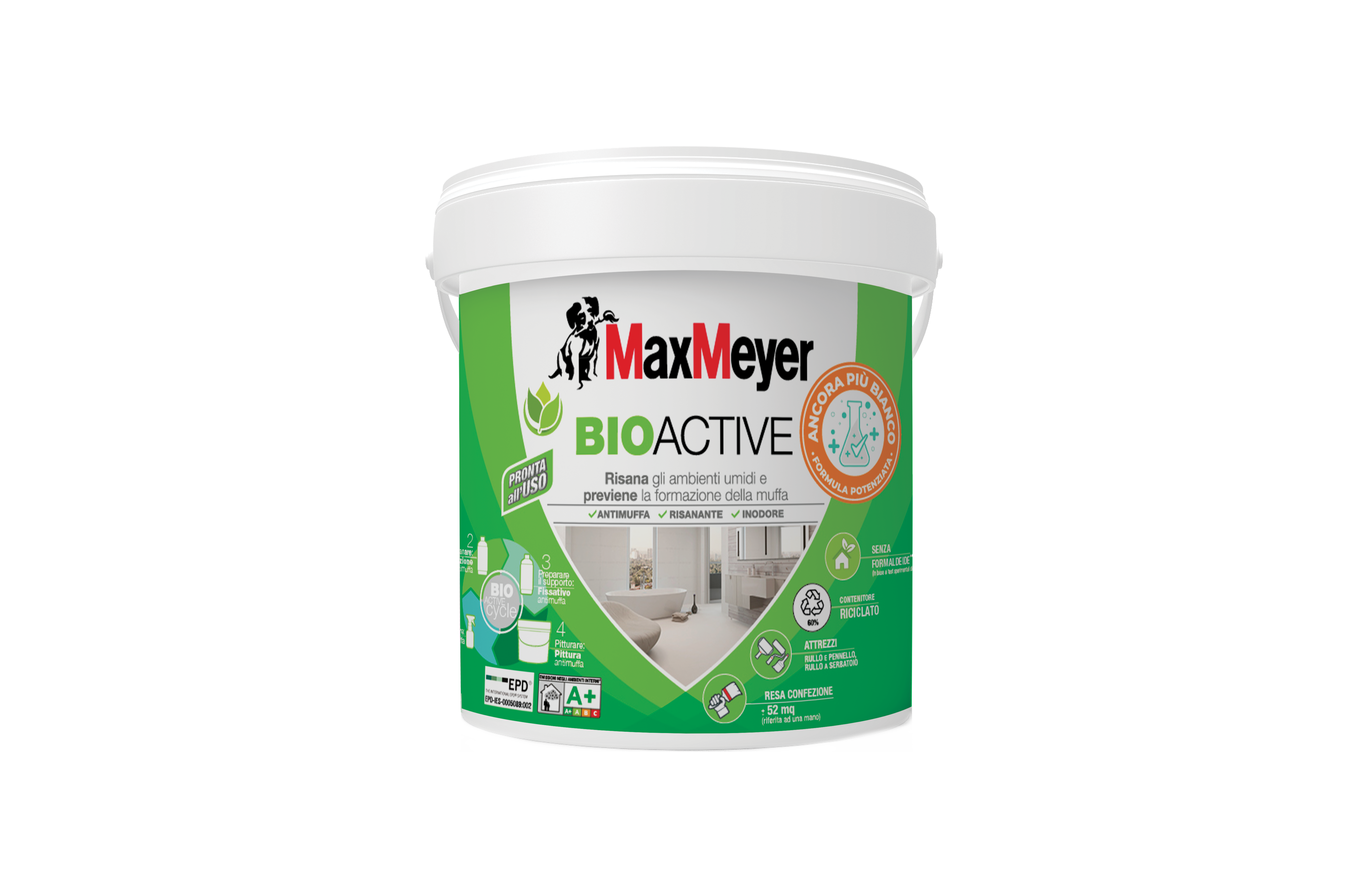 Bioactive A+ è una pittura antimuffa traspirante con azione preventiva e risanante contro la muffa. La pittura infatti, contiene speciali preservanti del film che garantiscono una protezione duratura contro la formazione di muffa. La pittura Bioactive A+ fa parte di un ciclo completo di prodotti per combattere ed eliminare in modo efficace la muffa dalle pareti della vostra casa. La sua formula potenziata garantisce un eccellente punto di bianco. Certificata A+, senza formaldeide, certificata EPD e contenuta in un imballo in plastica riciclata al 60%. Disponibile nel bianco nel formato da 4L