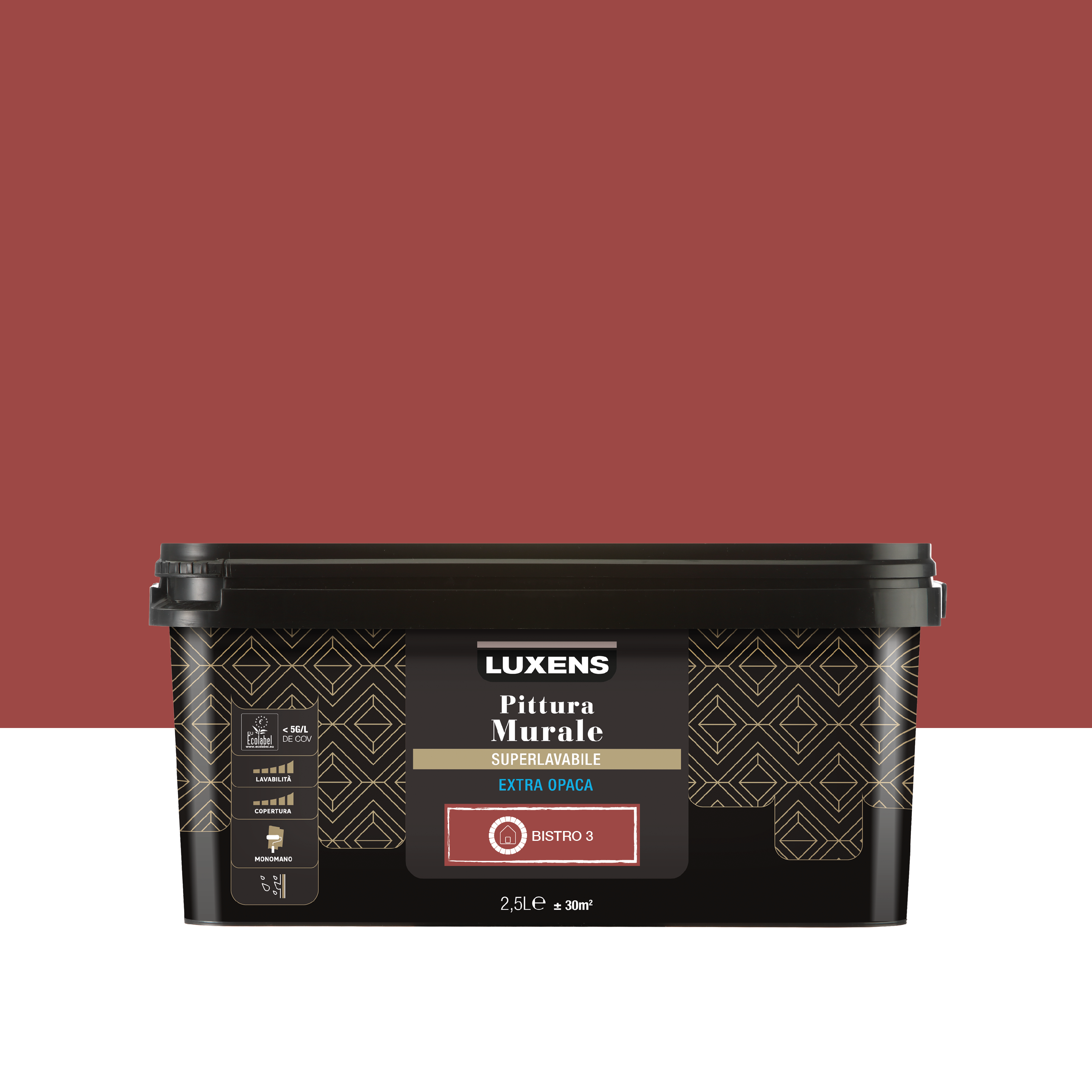Pittura murale da interno LUXENS di colore rosso bistro 3. Confezione da 2,5 litri che permette di coprire fino a 30 metri quadrati di superficie. L'aspetto opaco maschera le imperfezioni della parete e le irregolarità dell’ambiente. Il prodotto è pronto all'uso, non necessita quindi di diluizioni. Le pitture superlavabili sono ricche di resine e pigmenti, garantiscono un’ottima copertura e resistenza allo sporco e allo sfregamento. Il tempo di asciugatura è di 24 ore, ma sono sufficienti 6 ore di asciugatura tra una mano e l'altra. Trattandosi di una pittura a base acqua, eventuali gocce che cadono sulle superfici risultano facili da pulire con acqua calda. Data la composizione chimica del prodotto è sufficiente utilizzare acqua per la pulizia degli attrezzi. Disponibile campione formato 75 ML ref. 82343052.
